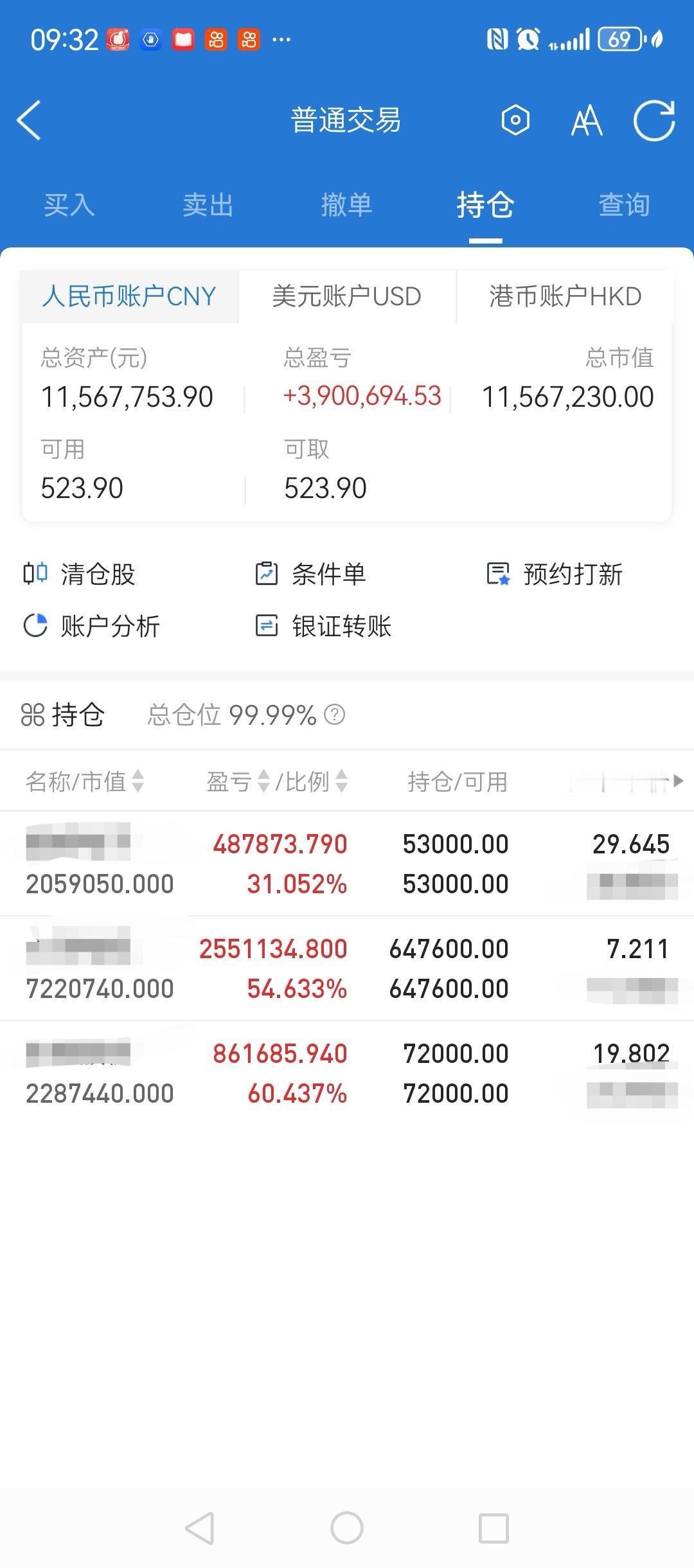 账户收益率6年430%左右,收益即将突破1000万。但这不是重点。 账户最大的亮点是2021年9月份之后,股票的买入到卖出就再没有出现过亏损。你所看到的2022和2023年的浮亏曲线,其实都是2021年9月份之前错误的不恰当的操作造成。 股票的买入和卖出算一次交易的话,从2021年9月份到现在账户的交易大概也就10次左右,极少。一年也就1~2次,偶尔达到三次。 我的理念是,好价格买入好股票不赚钱不卖,甚至不赚大钱不卖。 具体的说,就是择时买入处于上升趋势,且相对低位,交易相对活跃的主流行业的核心龙头个股,不赚钱不卖,甚至不赚大钱不卖。 接近百分百的成功率,最终会转化成很高的效率。有了高成功率和高效率,高收益率就会水到渠成。