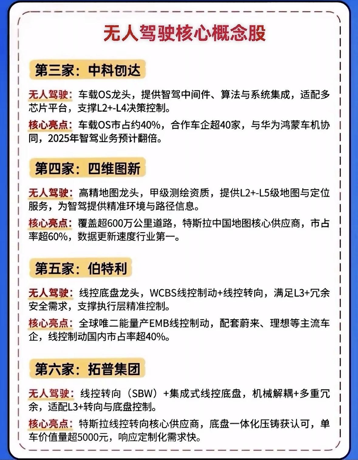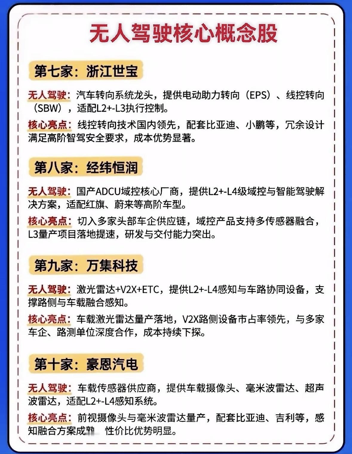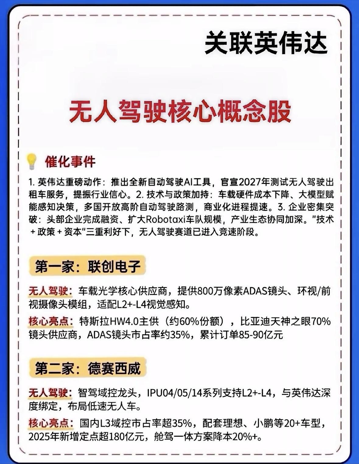 无人驾驶概念股全解析,带你领略科技前沿! 英伟达引爆无人驾驶赛道,技术政策资本三重催化。联创光学龙头供货巨头,德赛域控绑定车企加速商业化,产业竞速开启未来出行新篇章。 英伟达引爆无人驾驶赛道,联创电子光学龙头供货特斯拉比亚迪,德赛西威域控霸主绑定英伟达。技术政策资本三重催化,行业竞速开启。