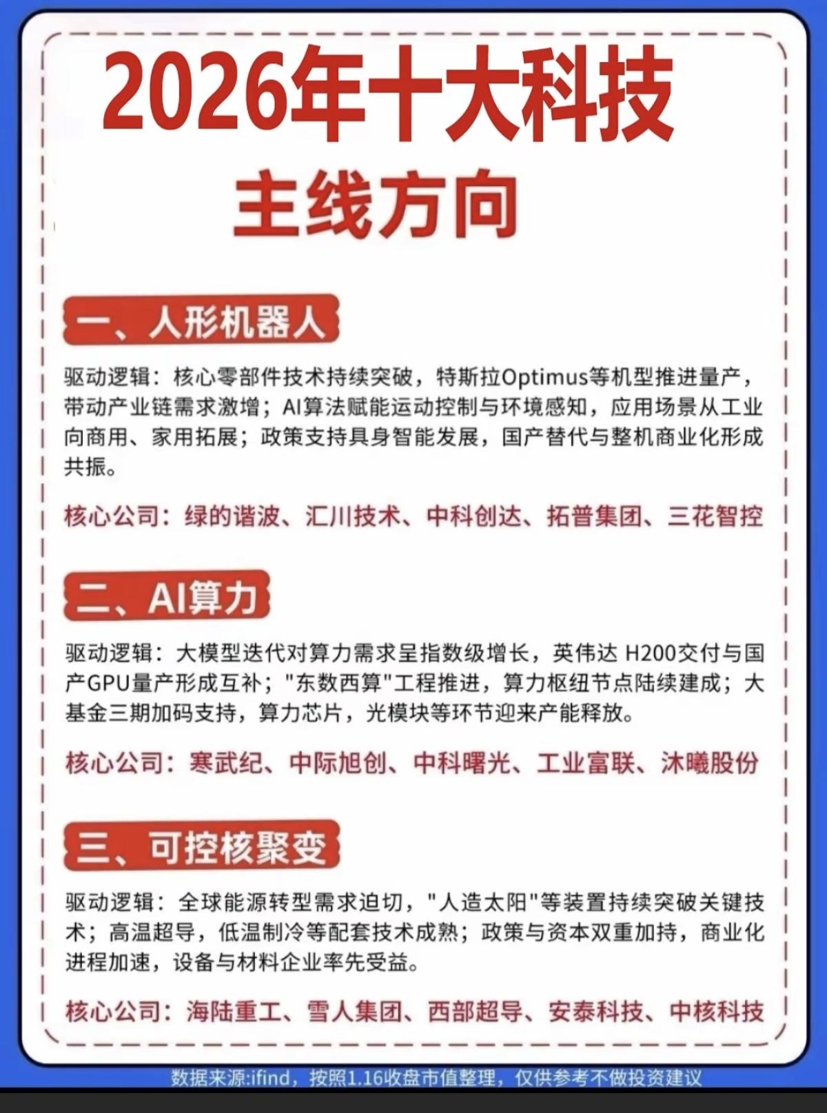 2026年:十大科技主线方向! 1.人形机器人 2.人工智能,AI算力 3.可控核聚变 4.智能驾驶 5.存储芯片,半导体 6.光刻机,液冷,6G通信
