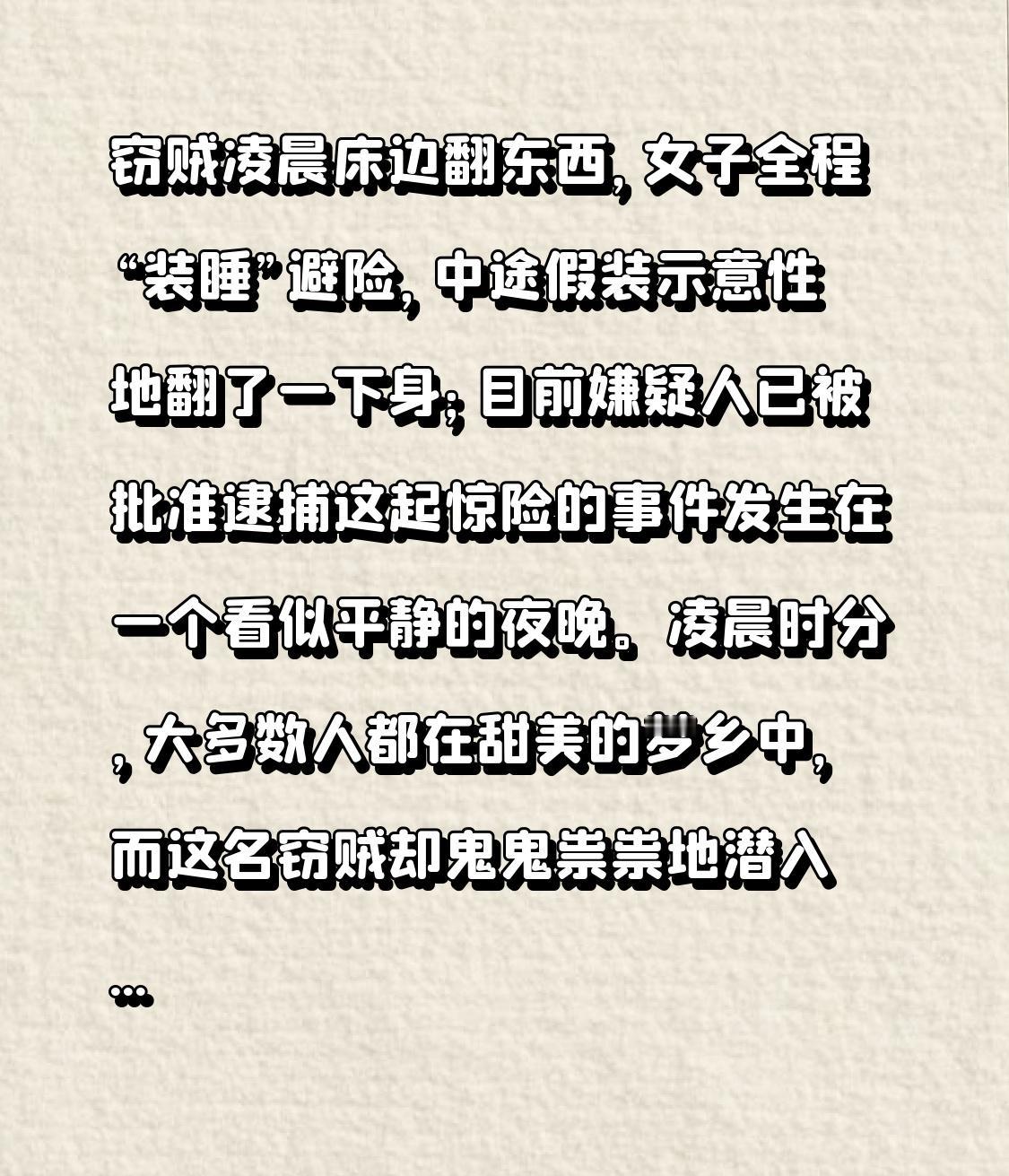 窃贼凌晨床边翻东西,女子全程“装睡”避险,中途假装示意性地翻了一下身;目前嫌疑人已被批准逮捕这起惊险的事件发生在一个看似平静的夜晚。凌晨时分,大多数人都在甜美的梦乡中,而这名窃贼却鬼鬼祟祟地潜入了女子的家中。他轻手轻脚地靠近床边,开始翻找财物,那窸窸窣窣的声音在寂静的夜里格外刺耳。 女子其实已在窃贼刚进屋时就惊醒了,恐惧瞬间笼罩了她。她深知自己势单力薄,若贸然反抗,很可能会激怒窃贼,给自己带来不可预知的危险。于是,她强忍着内心的恐惧,紧闭双眼,一动不动地“装睡”。 当窃贼在床边翻找东西时,女子的心提到了嗓子眼,每一次物品被挪动的声音都让她的心跳加速。中途,为了不让窃贼察觉自己是醒着的,她假装示意性地翻了一下身。这个简单的动作,对她来说却需要极大的勇气,她害怕自己的这个举动会引起窃贼的怀疑。 好在,窃贼并没有过多在意,继续翻找着。终于,窃贼拿了一些财物后匆匆离开了。女子在确认窃贼走远后,才敢睁开眼睛,颤抖着拨打了报警电话。 警方接到报警后,迅速展开侦查工作。通过现场勘查和调取周边监控,很快锁定了嫌疑人的身份。经过不懈努力,警方成功将嫌疑人抓获。目前,嫌疑人已被批准逮捕,等待他的将是法律的严惩。 这起事件也给我们敲响了警钟,在面对危险时,要保持冷静,运用智慧保护自己的安全。同时,我们也要加强家庭的安全防范意识,避免类似的事情再次发生。