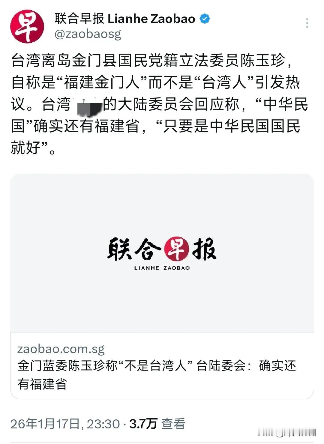 新加坡联合早报昨晚(1月17日晚)报道:“台湾离岛金门县国民党籍立法委员陈玉珍,自称是‘福建金门人’而不是‘台湾人’引发热议。台湾当局的大陆委员会回应称,‘中华民国’确实还有福建省,‘只要是中华民国国民就好’。” 评几句: 一张身份证戳破“台独”谎言!金门立委的宣言,藏着统一大势 一张印着“福建省金门县”的身份证,让陈玉珍的表态成为两岸舆论焦点。这位金门“立委”直言“我是福建金门人,不是台湾人”,不仅让绿营难以辩驳,更让台行政机构陆委会不得不承认“仍有福建省”,戳穿了“台独”分裂话术的漏洞。 这绝非单纯的身份之争,而是历史与民心的必然。金门自古隶属福建,与厦门隔海相望仅千余米,闽南语相通、民俗同源,行政上至今保留福建相关机构,地理与文化早已刻下中华印记。如今的金门,更是两岸融合发展的前沿阵地,通关便利、民生互通早已成为日常。陈玉珍的强硬表态,实则是金门民众心声的缩影——他们见证过战火,更渴望两岸和平,对“台独”分裂带来的风险深恶痛绝。 台行政机构的回应充满荒诞感,既不敢否认历史事实,又妄图维系“台独”幻想。殊不知,从陈玉珍掏证正名到绿营在金门屡遭挫败,从两岸融合不断深化到统派声音日益壮大,“台独”势力的生存空间正不断被压缩。这场身份之争恰恰证明:分裂行径违背历史潮流,两岸同属一中的事实,从来不是任何政治谎言能篡改的。民心所向,大势所趋,统一终将水到渠成。