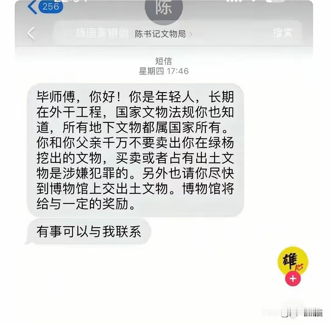 上交文物之前,先拍了视频发网络,这个网友的做法简直是绝了。 1月15日,湖北一位居民挖出一把疑似战国时期的青铜剑,他随即拍了视频并发布网络。 在不久之后就收到了自称文物局工作人员的短信,大概意思就是劝他要上交博物馆,并且告诉他买卖文物是非法的。 而这一居民本身也没有要买卖的意思,就把这个青铜剑上交了当地的博物馆,还因此获得了200元的奖励。 男子把这一事件的前前后后全都拍视频发网络以作记录,万一再出现找不到对不上号的情况,也可以让网友们做个证啊。