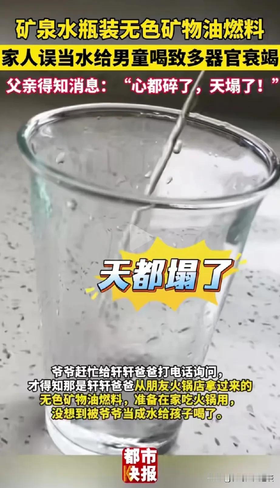 家里有孩子的要注意了。大人用矿泉水瓶装无色矿物油,孩子的爷爷把它当成矿泉水拿给孩子喝。导致孩子多个脏器衰竭,父母在外地打工,得知这个消息以后,心都要碎了。 所以说家里不要用矿泉水瓶饮料瓶装一些酒精,一些矿物油什么的,其他家人很容易把它当成矿泉水喝掉,或者给孩子喝。这样的事儿,时有发生的,所以家里有孩子的,一定要注意这个细节。