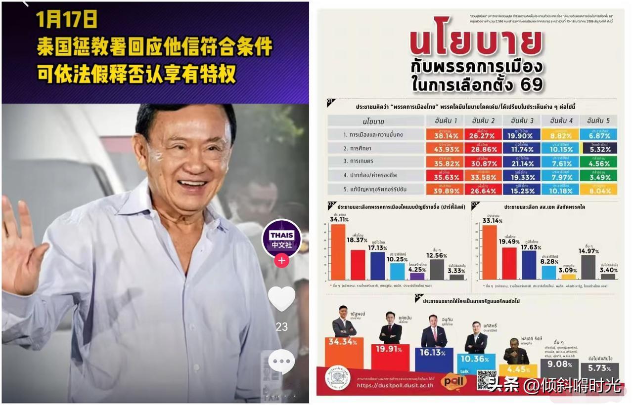 真是意想不到啊,距离泰国下次大选已不足一个月的时间,泰国最新民调显示,为泰党籍总理候选人育查南再次超过现任看守政府总理阿努廷,排名第二。当地时间1月18日,泰国川登喜大学民意调查中心公布最新民调,显示人民党党魁纳塔蓬在“支持谁当选总理”一项中,还是排名第一,育查南排名第二,阿努廷排名第三,最近泰国惩教署确认泰国前总理,为泰党精神领袖他信将于5月份,也就是大选结束后,依法获得假释,离开监狱,所以相信育查南成功几率会大大提升。