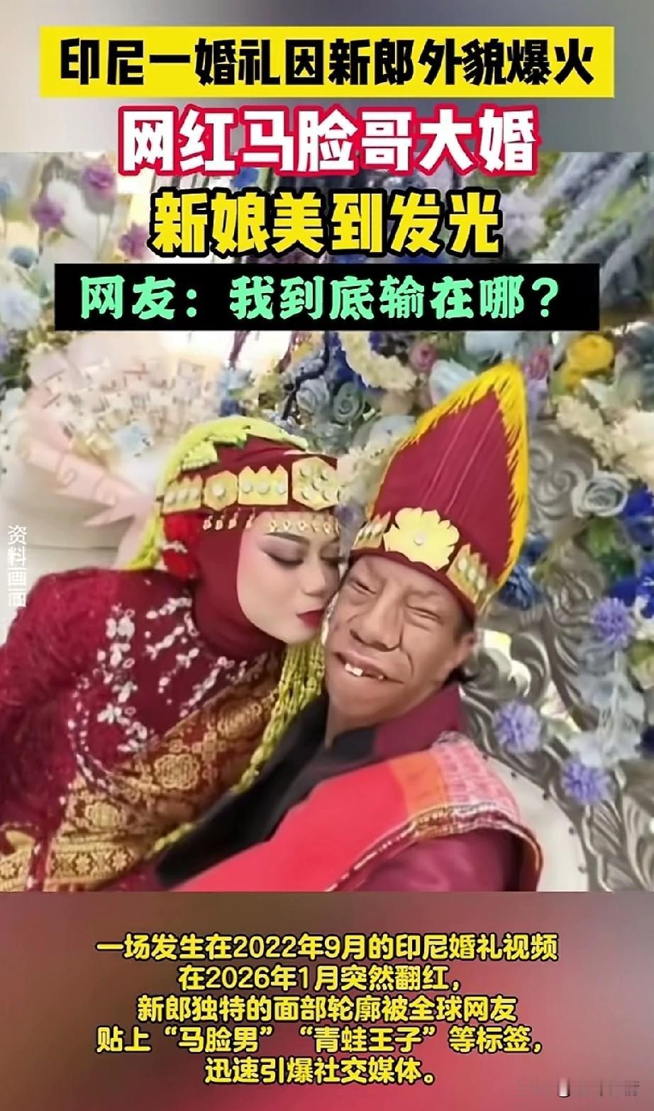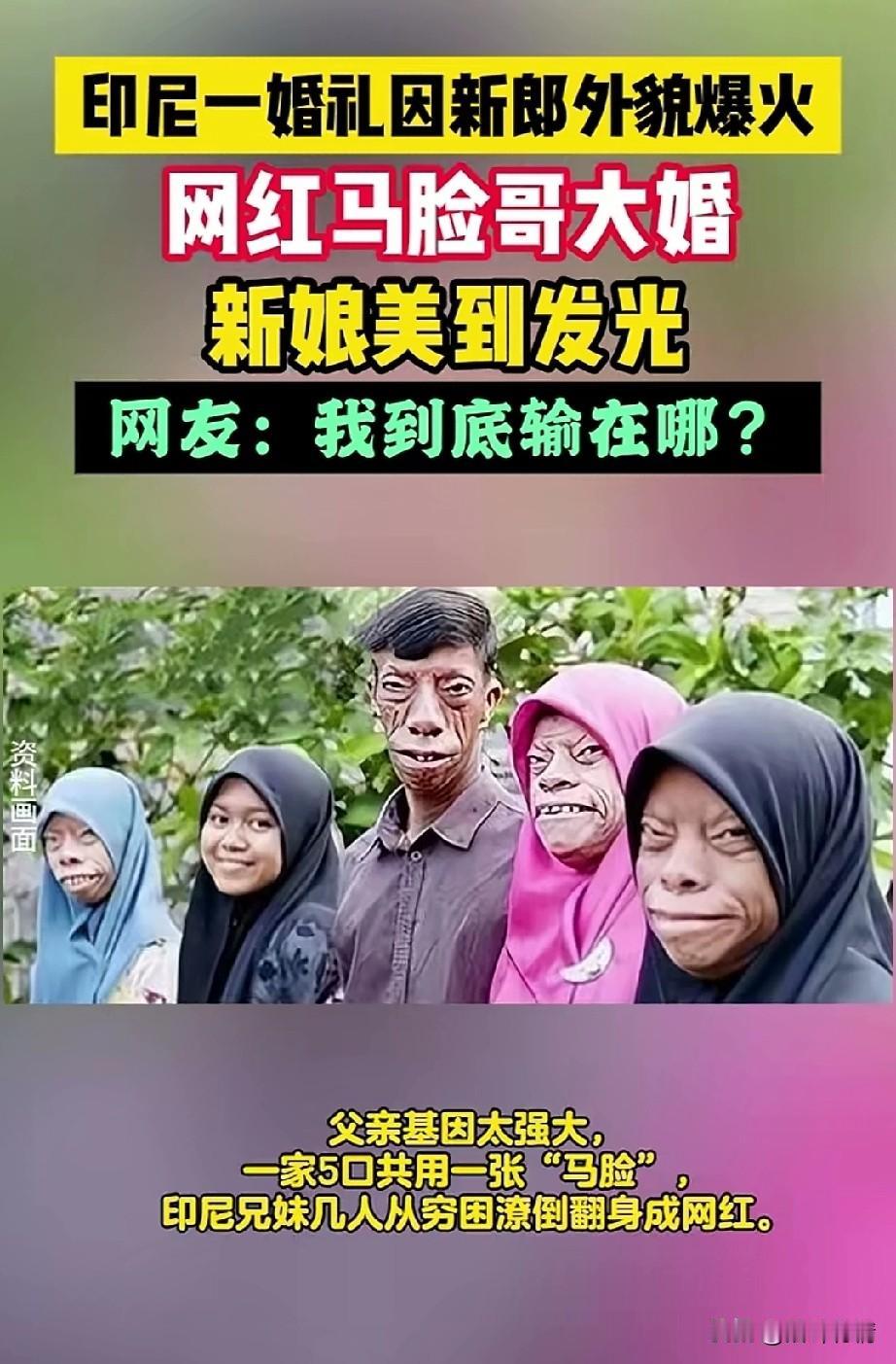 印尼的一场婚礼再次翻红, 原来是印尼的马脸哥, 他因为独特的面部结构, 被全球网友贴上了马脸男、青蛙王子等标签,他身边的女子非常漂亮, 这样一个人能娶到这么漂亮的媳妇儿, 还真是一件奇事, 另外他们一家五口共用了马脸, 可以看出他父亲基因的强大, 本来他们家庭贫困, 但是如今他们凭借奇特的长相, 居然成为了炙手可热的网红, 他们这条赛道, 一般人是模仿不了的, 毕竟长得有特色也算是长处, 毕竟大家都喜欢看稀奇古怪的, 如今他们一家五口活的相当滋润, 每天就是分享自己的生活, 轻轻松松钱就到账, 而且他们的粉丝是全球性的, 活脱脱一个全球网红, 对于马脸哥娶的漂亮媳妇儿, 很多网友纷纷非常羡慕, 他们不明白自己差在哪? 找个女朋友都费劲, 不像人家长成这样还能娶漂亮的媳妇儿,大家觉得马脸哥的媳妇儿和他是真爱吗? 印尼马脸 马脸男 印尼网红脸 马脸先生 印尼服婚纱照