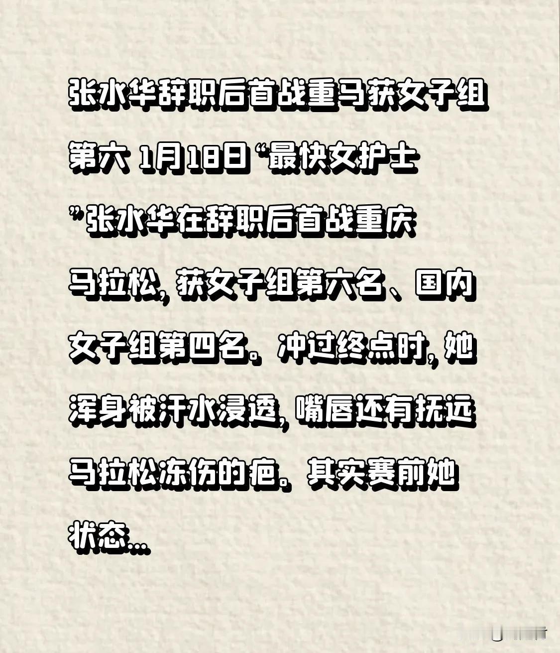 张水华辞职后首战重马获女子组第六 张水华辞职后首战重马获女子组第六 1月18日,“最快女护士”张水华辞职后首次出战重庆马拉松,获女子组第六名、国内女子组第四名。冲过终点时,她浑身汗透,嘴唇还留着抚远马拉松冻伤的疤痕。 实际上,赛前她状态欠佳,此前比赛受伤,训练量有所减少。即便如此,这一成绩仍超出她和丈夫的预期。 张水华2017年开始长跑,2025年哈马夺冠后哭诉调休问题引发争议,还遭遇网暴。2026年1月,她辞去工作。此次重马是她第三次参赛,赛后她打算进行冬训,期望取得更优成绩。比赛时听到加油声,她十分感动。 女护士跑马拉松 马拉松护士争议 护士马拉松 马拉松女子排名