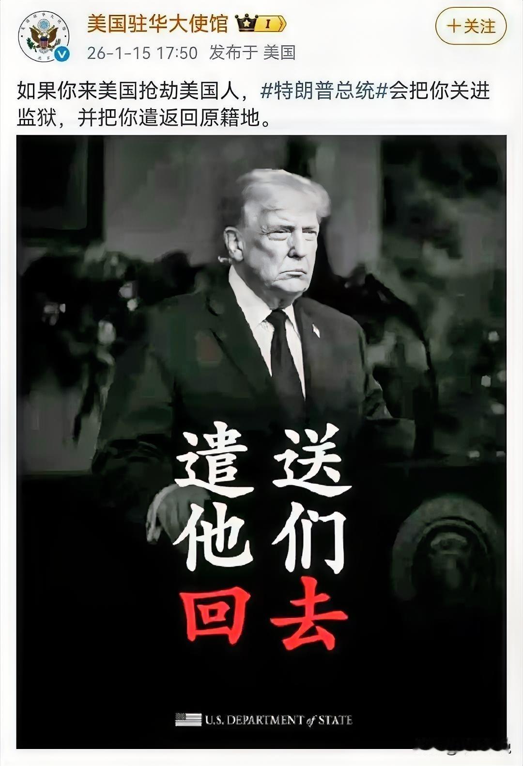 润人们的心碎了,特朗普要把他们遣送回国了 美国驻华大使馆通过社交平台发了一张写有“把他们遣送回去”的特朗普图片,同时配文“如果你来美国抢劫美国人,特朗普总统会把你关进监狱,并把你遣送回原籍地”。 这张图片我们看着很平常,但是已经在美国的润人们估计要崩溃了,毕竟这意味着他们极有可能会被遣送回国了。
