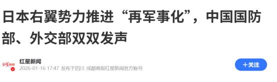 中方双双发声!2026年1月16日,国防部,外交部齐登台!只因日本右翼势力推进“再军事化”,中方通知日本!   日本首相公然发表涉台言论,就证明了日本军国主义在死灰复燃。而在发表错误言论后,我国发布多则警告,要求日方撤回错误言论并进行悔改。   但日本没有丝毫的悔改之意,反而进一步的去推动军事化。就这一点,我国多次向国际发出警告。   就在2026年1月16日的时候,中国国防部以及外交部双双发声!国防部就日本涉军问题表态,毫不避讳的强调日本右翼保守势力急剧膨胀。不断强军扩武,加速推进再军事化,正将日本引上一条不归路。   同时指出历史早已证明,日本的军国主义野心一旦失控,将会给亚洲国家带来严重威胁。这是对国际的再一次警告,国际应坚决的去遏制日本任何军国主义死灰复燃的迹象。   而在国防部发声的同时,外交部也对此事进行表态。外交部发言人明确表示,坚决抵制日本军国主义死灰复燃。对于日本同菲律宾加强军事合作这一点,强调日本曾在二战期间侵略菲律宾。   日本在东南亚国家犯下了滔天的罪行,而现如今日本编造武器去扩军备武。其行为就已经证明了日本在逐步的推动军事化,试图让军国主义死灰复燃,再次破坏地区的和平与稳定。   所以针对这一点,国际以及东南亚国家就应该高度关注。坚决抵制的同时,要控制日本的军国主义野心,不会出现失控的情况。   对此,您怎么看?欢迎评论区留言您的看法。 (信息来源:日本右翼势力推进“再军事化”,中国国防部、外交部双双发声-红星新闻)