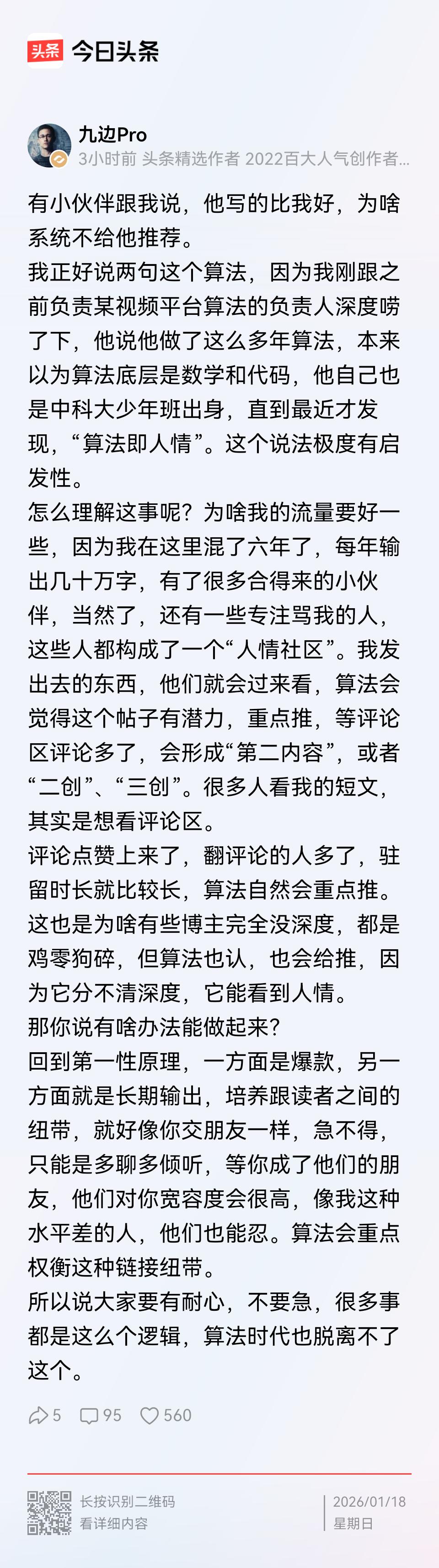 自媒体顶级大V“九边”,这一次毫不保留传授了他如何将自媒体做起来的真正秘诀! 九边说,为啥他的流量就是比别人好?甚至有些时候写了一些鸡毛蒜皮的小事,质量也不高,但仍旧比别人好?原因很简单,两个字:算法! 九边说他专门跟负责某视频平台算法的工作人员进行了一番深度交流,弄明白了算法推荐的底层逻辑,那就是“算法即人情”。这个是什么意思呢?就是说,关注九边的人很多,九边不管写了什么内容,这些人都会去转发、评论,这样就形成了讨论度,讨论度多了,算法发现你的这个内容有流量,那么就会给你进行二次推荐,放到更大的流量池子里面去,一篇爆款也就形成了。 这里促成九边爆款的,并不仅仅是他本身的写作,还有关注他的人根据他的内容所做出的各种转发、评论、二次创作。这里其实就形成了一个“人情社会”,你有人关注了,大家注意到你了,你的内容就是容易更火。 写到这里,问题就在于,如何才能有这个关注度?九边有那么庞大的粉丝,但是其他人都是新人,没有粉丝啊!这个其实就要回到第一性原理了,罗马不是第一天建造而成的,只能慢慢来。 每天坚持写文,慢慢攒粉丝,攒关注度,写个一年、两年,自然就有可观积累。九边最开始写作,也是写了好几年,都没有什么关注度,是不断坚持,这才有了后面的爆火。