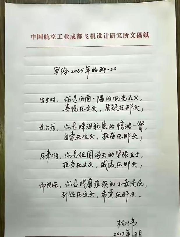 歼-20总师杨伟,一张亲笔原稿突然被人发了出来。纸上写的不是参数,不是指令而是一首词。 麻烦看官老爷们右上角点击一下“关注”,既方便您进行讨论和分享,又能给您带来不一样的参与感,感谢您的支持! 这张纸一露面,就把很多人看愣了。一个搞第五代战机的总师,平时开口闭口都是气动布局、矢量推力、隐身涂层,怎么突然整出一首词来?而且写得还挺用力,纸边都快被笔尖划破了。 落款时间是2017年,抬头直接写给“18年后的歼-20”。这操作太反差了,像个硬核程序员忽然给代码写了一封情书。 2017年那会儿,歼-20刚在朱日和阅兵亮过相,全国人民刚松了一口气,觉得“有了,牛了,稳了”。可杨伟没跟着大家一起庆祝。他在纸上把时间钉死在2035年——那是中国国防现代化要冲刺的关键年份。 他不是在感慨过去,而是提前给飞机列了一份“成年后必须达标”的清单:更聪明的脑子、更狠的电子战、更灵活的弹药适配,说白了,他把对未来战场的焦虑,全压进了这几行字里。 1997年,那年他35岁,接下总师任务时,中国连第五代战机的边都没摸到,国外不给图纸、不给数据、不给口风,等于让你空手造火箭。 团队窝在成都,灯从晚上亮到天亮,桌上泡面盒子摞得跟小山似的,谁家孩子生日、谁家老人住院,都得先往后排,杨伟自己也一样,女儿的家长会基本没开过几次,那时候他不是在设计飞机,是在跟时间赛跑,跟资源赛跑,跟“不可能”赛跑。 直到2011年1月11日,首飞那天,成都上空阴沉沉的,战机离地那一瞬,杨伟站在停机坪,眼睛一下就红了。14年,从零到上天,中间踩碎了多少技术瓶颈,咽下了多少“不行”“做不到”。那一飞不是结束,是把“中国行不行”这道题彻底撕了。 可杨伟没停在“行不行”上。2017年写词的时候,他已经把问题升级成“够不够狠”“能不能一直狠”。他清楚,隐身、超巡、超视距这些东西,2035年可能只是入门票。 未来战场大概率是有人机带着一群无人机群殴,是电子战先把对方眼睛戳瞎,是新弹药把射程和精度再拉一个量级,他把这些预判藏进词里,不是矫情,是怕自己和团队懈怠,是怕后来人忘了初心。 中国军工这帮人,大多有这股子“两面性”。一边是实验室里抠参数到小数点后五位,一边是心里藏着家国两个大字,宋文骢搞歼-10的时候也这样,唐长红弄运-20的时候也这样。他们造的不是冷冰冰的铁疙瘩,是把二十多年青春焊进去的信念。 现在回头看,杨伟的18年之约正在兑现。歼-20已经不是阅兵时的“新人”了,双座型出来了,改进型也出来了,东海、南海巡航成了日常,它不再只是亮相的工具,而是实打实的空域主宰。 新一代航电更快,协同能力更强,隐身涂层更耐,每一项升级,都像在回应那张纸上的叮嘱。 一张泛黄的手稿为什么能刷屏?不是因为词写得有多惊艳,而是因为它把硬科技和软心肠撞在了一起。你看杨伟,他不是把歼-20当工具,而是当孩子养,写信的姿势、用词的语气,都像父亲在交代“以后要好好照顾自己,别让人欺负”。这种温度,比任何官方发布都来得直接。 时间走到今天,离2035年只剩不到十年。歼-20还在往前冲,团队还在加班加点,那张纸上的约定,已经从一纸文字,变成了天上呼啸的实际存在。它证明了一件事:真正能让国之重器立得住的,从来不是材料多高级、算法多牛,而是背后那帮人愿不愿意把命搭进去。