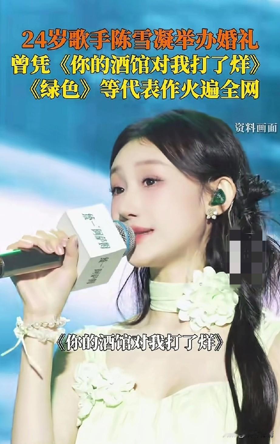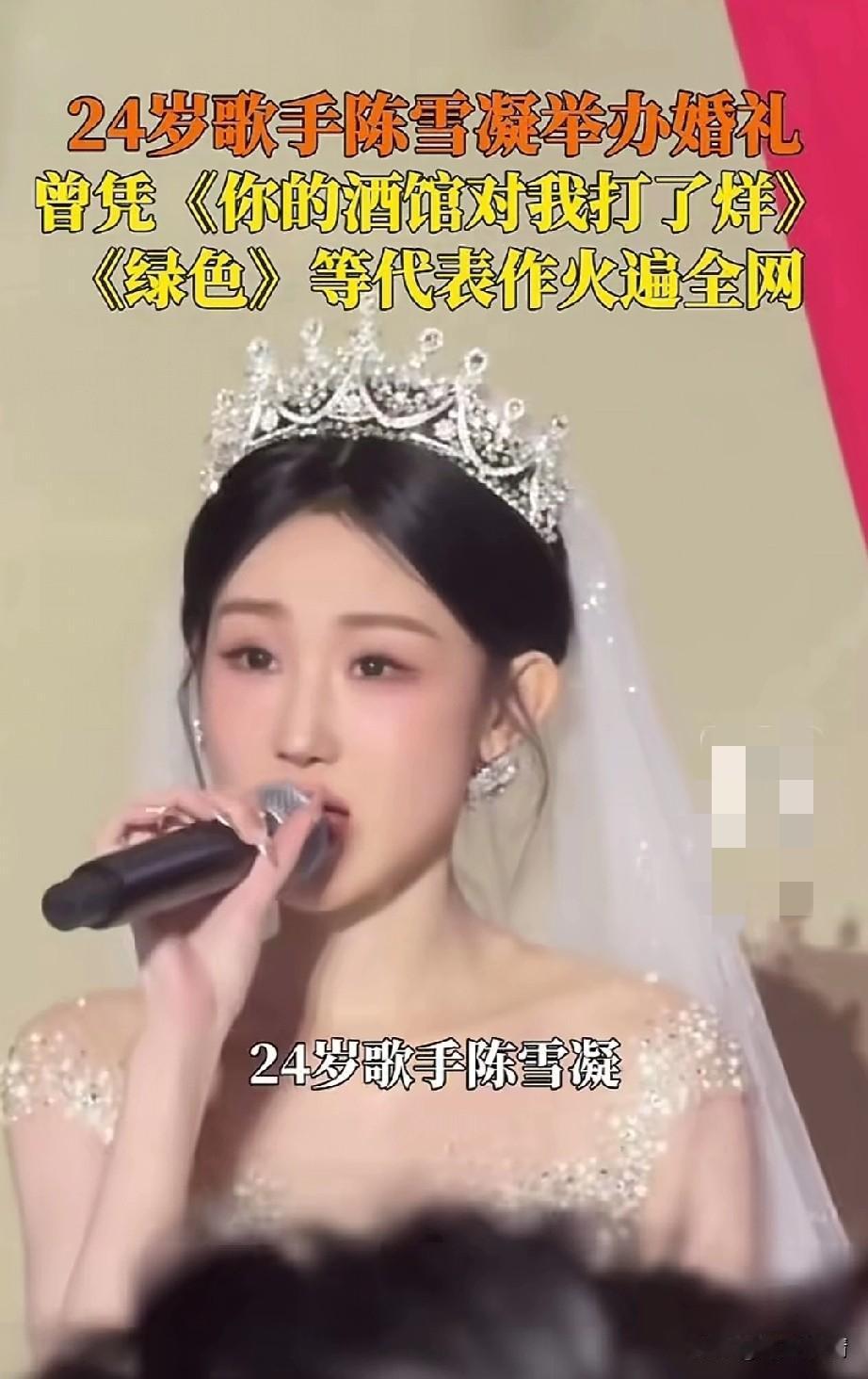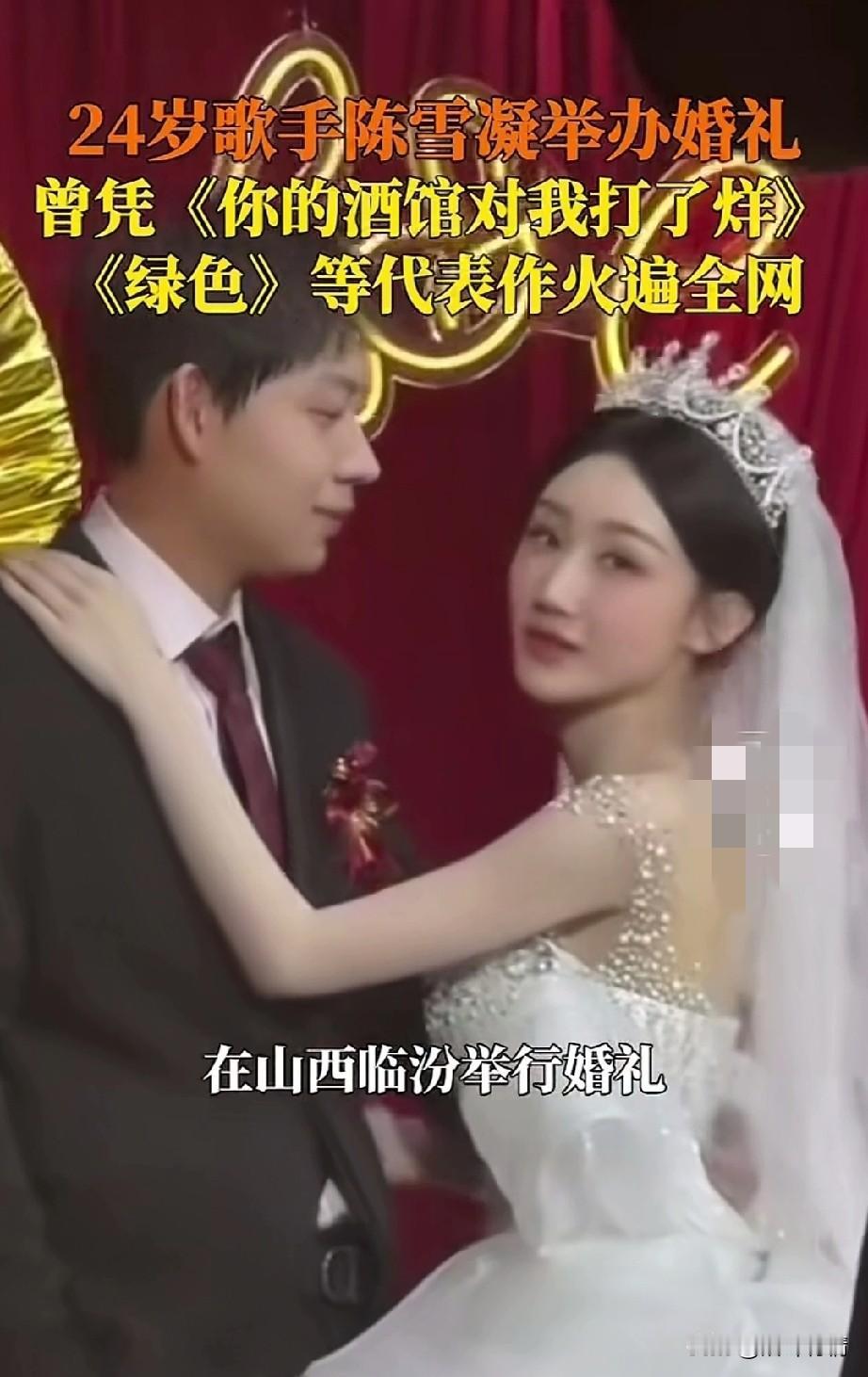 24岁歌手陈雪凝结婚了, 他的男友是山西临汾人, 她曾经凭借《你的酒馆打烊了》和《绿色》在网络上火的一塌糊涂, 可以说是人美,还有才, 倒是在去年的12月份宣布了恋情, 不过后来又删除了恋爱照片, 一度让外界猜测她的感情生活出了问题, 不过这次直接发出了结婚的视频, 算是辟谣了,可以看出两个人非常的恩爱,婚礼现场,陈雪凝唱着情歌走向了她的老公,她的老公也是非常的帅气, 她的粉丝们都纷纷献出了祝福, 婚姻毕竟是美好的, 希望两个人可以一直幸福下去! 山西 陈雪凝