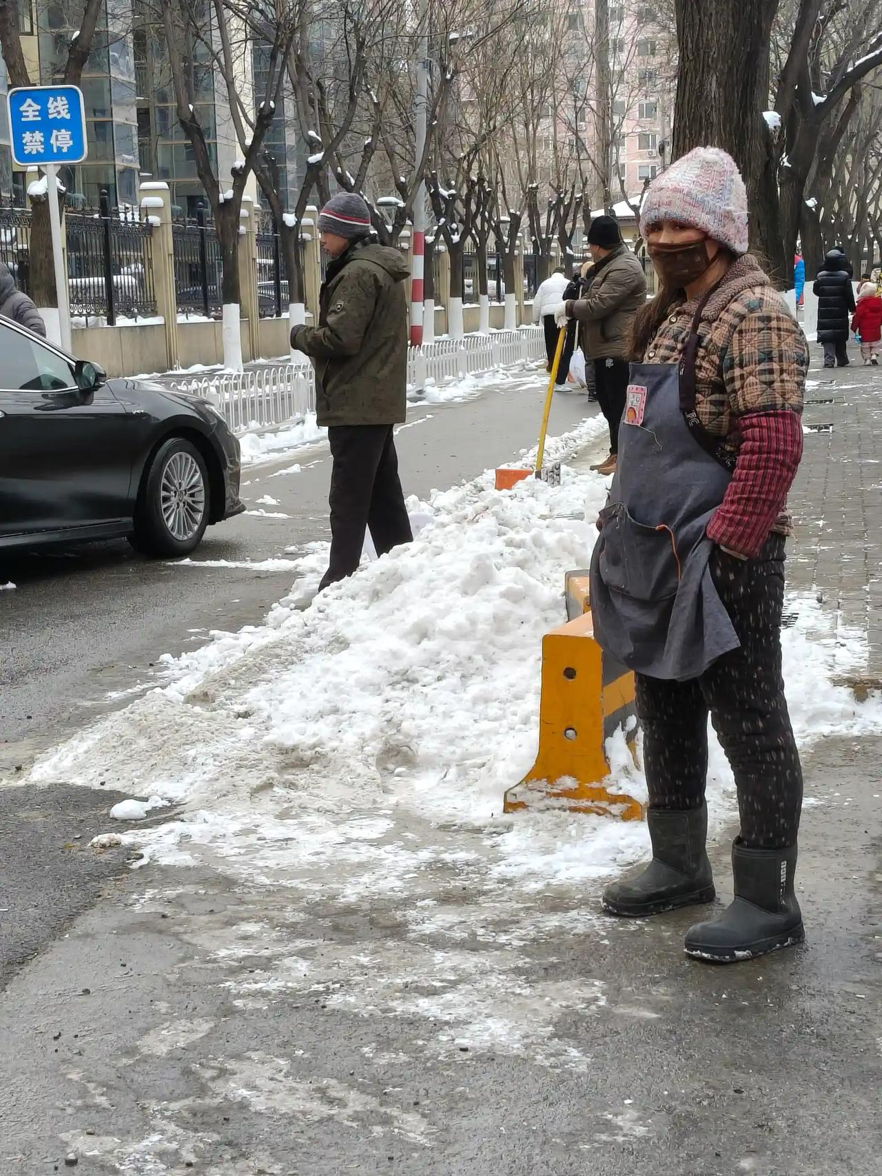 现在的北京雪刚停,人行动,志愿者,扫雪中,不用融雪剂,人工行动中,爱护绿水青山,共同呵护家园!一