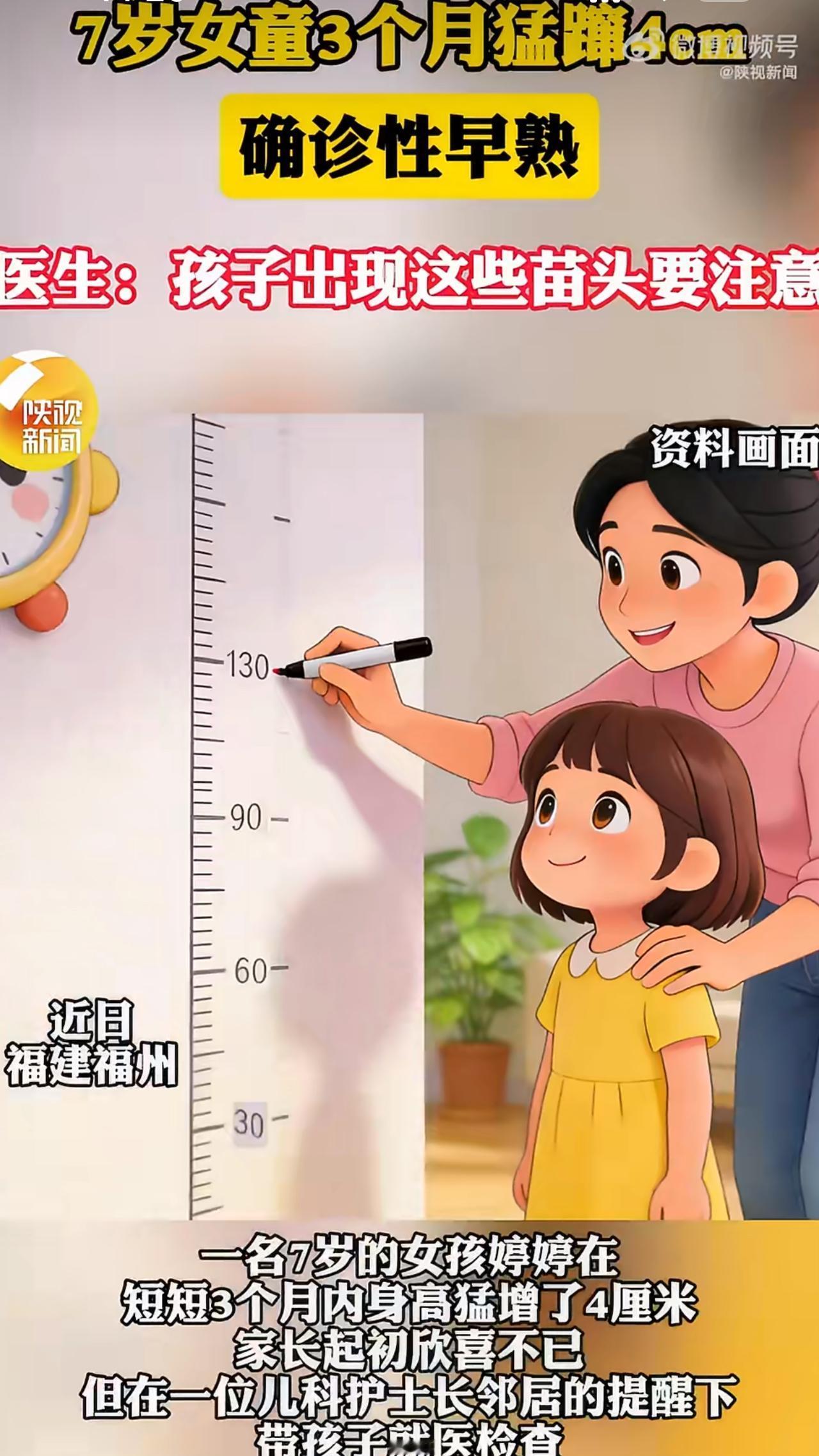最近有个新闻让不少家长揪心:福建一个7岁的小女孩婷婷,短短三个月身高猛窜了4厘米,家长本来挺高兴,结果一检查,医生说是性早熟,这事儿听起来有点吓人,但咱们得先弄明白,啥是性早熟?为啥会发生在这么小的孩子身上? 性早熟,简单说就是孩子在不该发育的年龄,提前出现了第二性征发育,比如女孩在8岁前乳房发育、月经来潮,男孩在9岁前睾丸增大、长胡须,都属于性早熟,婷婷的情况就是典型——7岁的女孩,乳房开始发育,子宫和卵巢也变大了,这些都是性早熟的信号。 那为啥会这样呢?医生说,原因挺复杂,但跟现在的生活环境脱不了干系,比如,现在孩子吃得太好,高糖、高脂肪的食物吃多了,容易营养过剩,刺激身体分泌更多激素,还有,有些家长喜欢给孩子吃补品,像蜂王浆、动物内脏,甚至反季节的蔬菜水果,这些可能含有激素,长期吃也会影响孩子发育。另外,环境里的“隐形杀手”也不少,比如塑料制品里的双酚A、化妆品里的雌激素,孩子接触多了,内分泌系统容易紊乱,诱发性早熟,性早熟可不是小事,它会影响孩子的身高和心理,因为激素提前分泌,孩子的骨龄会跑得比实际年龄快,骨骺提前闭合,导致成年后身高比同龄人矮,婷婷现在虽然长得快,但医生预测她成年后的身高可能不到1米5,这就是骨龄超前的后果,心理上,孩子会因为身体变化和同龄人不一样,产生自卑、焦虑,甚至被同学嘲笑,影响社交和性格发展。 那发现孩子性早熟,家长该怎么办?首先,别慌,赶紧带孩子去儿童内分泌科检查,明确是中枢性性早熟还是外周性性早熟,再针对性治疗,比如,如果是中枢性的,医生可能会用促性腺激素释放激素类似物,抑制性激素分泌,延缓发育进程,如果是外周性的,可能需要用芳香化酶抑制剂,减少雌激素生成。除了吃药,生活调整也很重要,饮食上,少吃高糖、高脂肪的食物,避免含激素的补品,多吃蔬菜水果、全谷物,保证优质蛋白摄入,像鱼、豆制品,运动上,每天保证1小时中等强度运动,比如跳绳、游泳,有助于控制体重,延缓骨龄进展。睡眠也不能忽视,晚上保持环境黑暗,促进褪黑素分泌,避免熬夜。 心理疏导同样关键,家长要用孩子能理解的语言解释身体变化,避免他们产生羞耻或焦虑。,可以通过绘本、动画帮孩子认识发育过程,鼓励他们参与集体活动,转移注意力。如果孩子情绪低落,及时找心理医生帮忙。性早熟 事件来源:陕视新闻