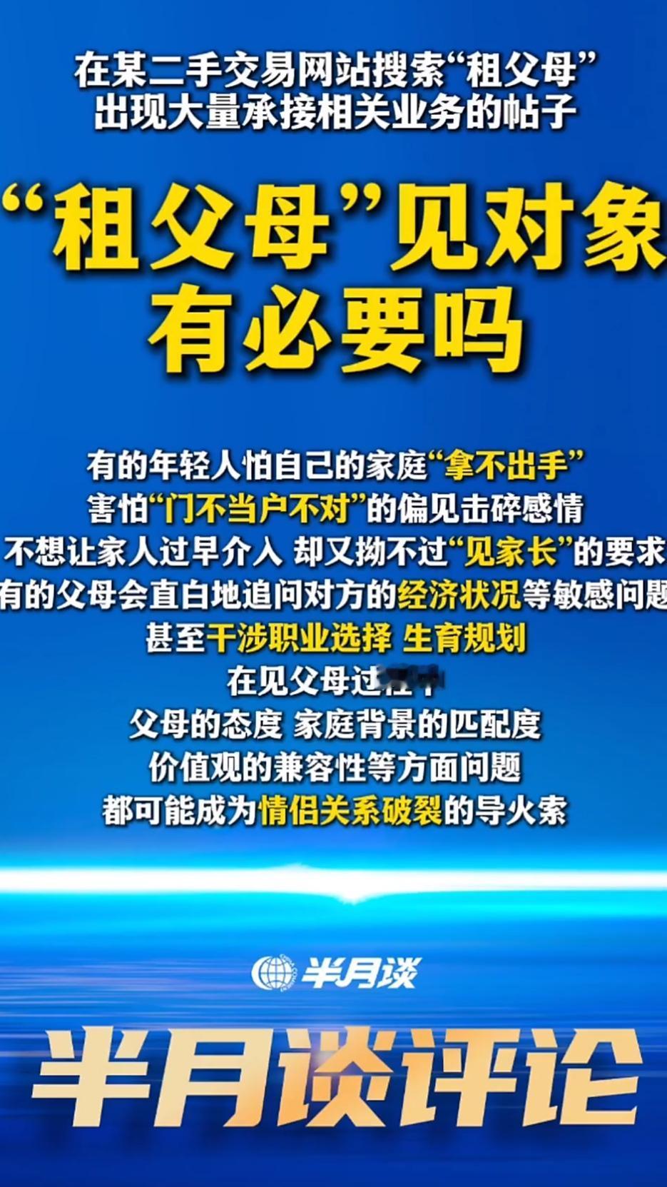 最近社交平台上有个特别火的词——“租父母”。简单来说,就是有些年轻人为了见对象父母,花钱雇演员来假扮自己的爸妈,这事儿乍一听像电视剧里的狗血桥段,可现实里真有不少人在做,甚至形成了产业链。 打开二手交易平台,搜索“租父母”,立马跳出成百上千条帖子,商家们打着“生活演员”“情绪到位”“包满意”的旗号,提供从基础见面到定制化服务的全套方案,比如,演员会提前学方言、熟悉不同地区的待客礼仪,连催婚、催育这类敏感话题都有应对话术,有位记者联系商家时,对方直接发来十几张演员照片,标注着年龄、身高、鞋码,甚至能根据客户需求匹配“沉默寡言的退休公务员爸爸”或“温柔体贴的护士妈妈”。为什么年轻人要花这份冤枉钱?背后藏着不少无奈。有人是怕自己家庭“拿不出手”——比如父母离异、经济条件一般,担心对方父母嫌弃;有人是恋爱关系还没稳定,不想让家人过早介入,可又拗不过“见家长”的要求;还有人是因为两代人婚恋观念冲突,比如父母总追问收入、干涉生育计划,查户口式的交流让年轻人压力山大,干脆找个“通情达理”的演员来撑场面。 但这种“临时亲情”真的能解决问题吗?答案是否定的。爱情不是演戏,靠谎言堆砌的关系,就像建在沙滩上的房子,风一吹就塌。有位网友分享过自己的经历:为了见女友父母,他租了“高知家庭”的演员,结果吃饭时被问到“你爸最近在写的论文主题”,演员当场卡壳,场面尴尬到能抠出三室一厅,更可怕的是,一旦谎言被戳破,不仅恋人之间的信任崩塌,两个家庭也可能陷入对立——毕竟,谁愿意自己的孩子被欺骗呢? 更值得警惕的是,这类服务还藏着不少风险。有商家会泄露客户隐私,比如把年轻人的恋爱细节卖给营销号;有演员坐地起价,临时加钱;甚至有人借“租父母”实施诈骗,比如虚构家庭背景骗取彩礼。法律专家提醒,“租父母”的雇佣合同本身就违背公序良俗,一旦出现纠纷,当事人很难维权。说到底,“租父母”火爆的背后,是年轻人对婚恋的焦虑,也是两代人沟通的缺失。父母总担心孩子选错人,习惯用“查户口”的方式表达关心;年轻人则害怕被评判,选择用谎言逃避压力。其实,真正的亲情和爱情,都经不起欺骗。与其花钱雇演员演戏,不如坐下来和父母、恋人坦诚聊聊——毕竟,能包容你不完美的人,才值得托付终身;能和你一起面对问题的人,才是对的人。扮演家长父母 全国租父母 不少人选择租父母见对象 事件来源:半月谈