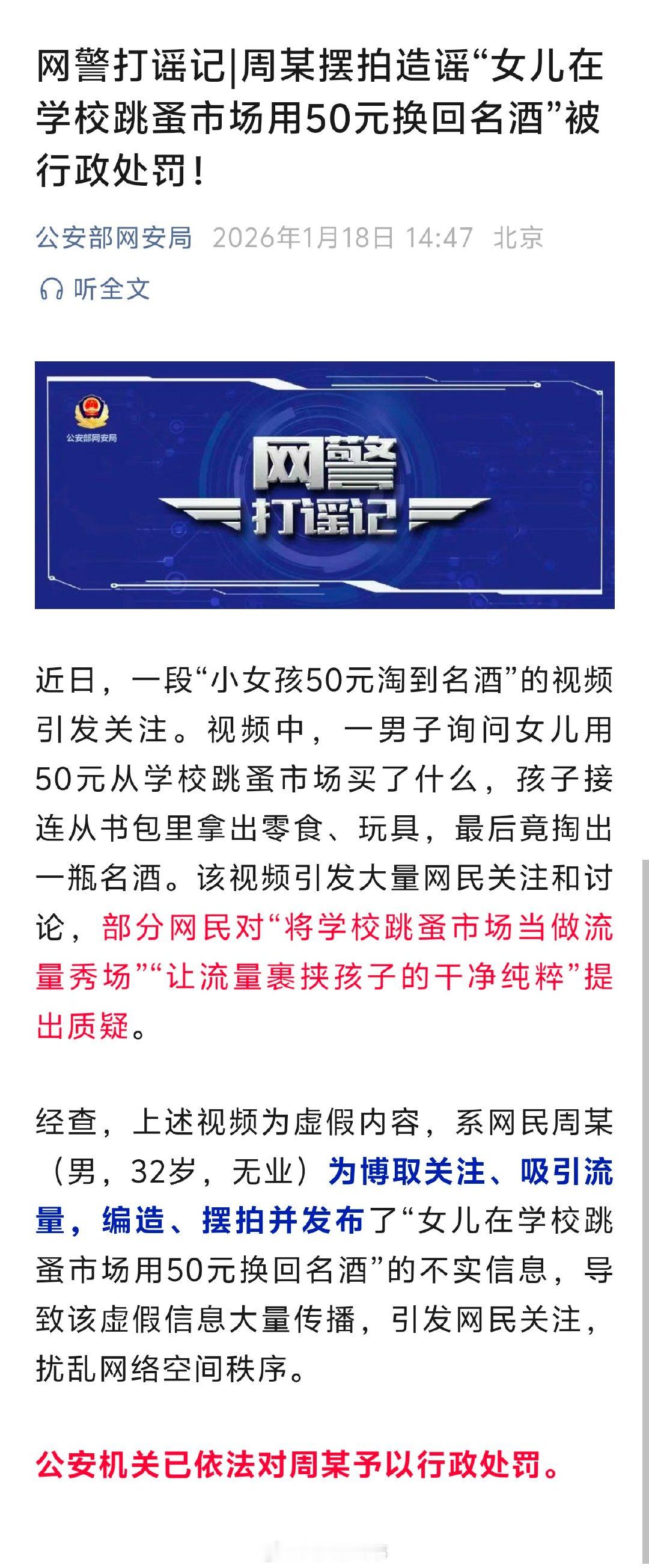 【男子编造女儿50元淘到名酒被处罚】警方通报男子摆拍女儿50元淘到名酒近日,一段“小女孩50元淘到名酒”的视频引发关注。视频中,一男子询问女儿用50元从学校跳蚤市场买了什么,孩子接连从书包里拿出零食、玩具,最后竟掏出一瓶名酒。该视频引发大量网民关注和讨论,部分网民对“将学校跳蚤市场当做流量秀场”“让流量裹挟孩子的干净纯粹”提出质疑。经查,上述视频为虚假内容,系网民周某(男,32岁,无业)为博取关注、吸引流量,编造、摆拍并发布了“女儿在学校跳蚤市场用50元换回名酒”的不实信息,导致该虚假信息大量传播,引发网民关注,扰乱网络空间秩序。公安机关已依法对周某予以行政处罚。(公安部网安局)