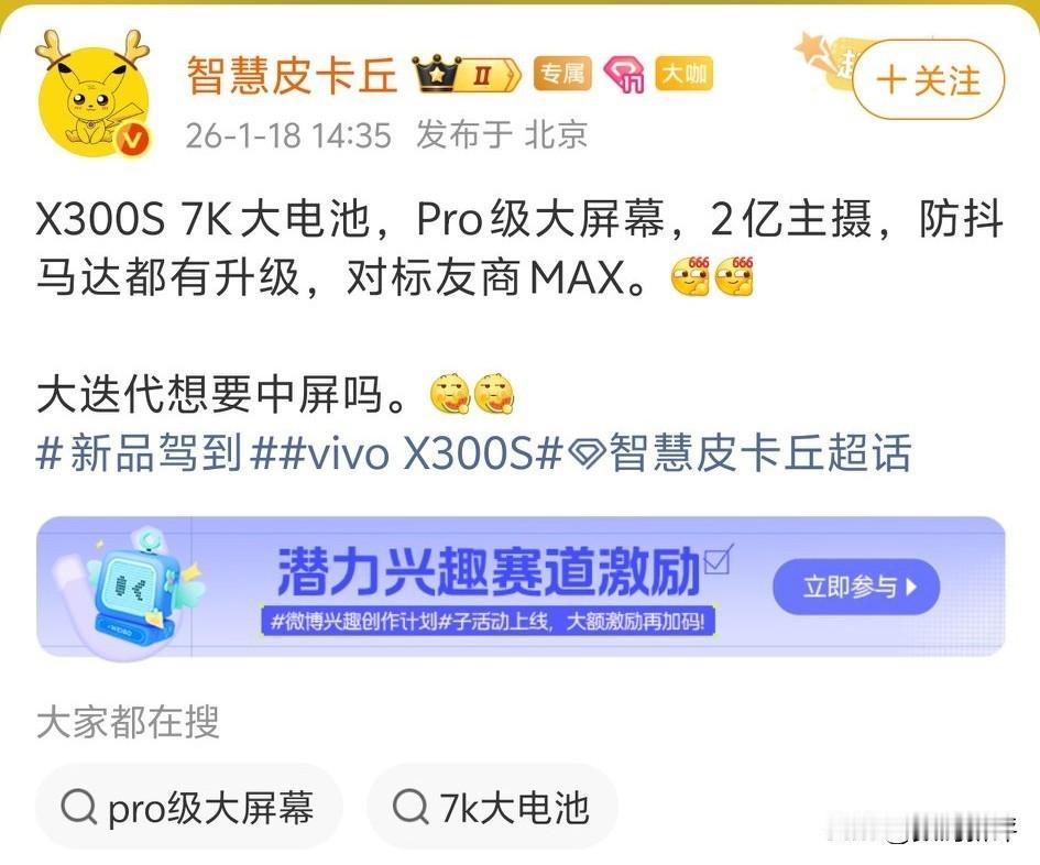 vivoX300s最新爆料,7K毫安电池,Pro同款机身尺寸和屏幕,还是两亿像素主摄,优化防抖可能还有新滤镜玩法[思考]马达也有升级,对标友商max?这里说的难度是小米17PM?关键小米系马达也不大[捂脸]内存涨价,X300s不知道涨价多少,7K毫安电池在26年算是小电池了,处理器还是天玑