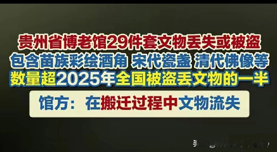 盗墓贼偷文物还得昼伏夜出、提心吊胆,你们倒好——贵州博物馆搬个家,29件文物说没就没了! 清代的佛像、苗族的彩绘酒角、宋代的瓷盏,哪一件不是带着时光印记的宝贝?就这么在“搬迁”的名头下凭空蒸发,数量还占了2025年全国被盗丢文物的一半! 博物馆是干啥的?是给文物当“保险箱”的地方啊!结果呢?盗墓贼还得费尽心机钻空子,你们倒好,光明正大管着宝贝,转头就给弄丢了。是清点时闭着眼睛数的?还是觉得这些老物件不如一张废纸金贵? 一句“搬迁流失”就想了事?这背后是多少历史细节的断裂?是多少祖辈手艺的湮灭?拿文物当可以随意丢弃的垃圾,这失职,寒的是所有人的心! 必须查!查清楚到底怎么丢的,查清楚谁该担责,查清楚能不能追回来!别让“保护者”成了“弄丢者”的遮羞布!