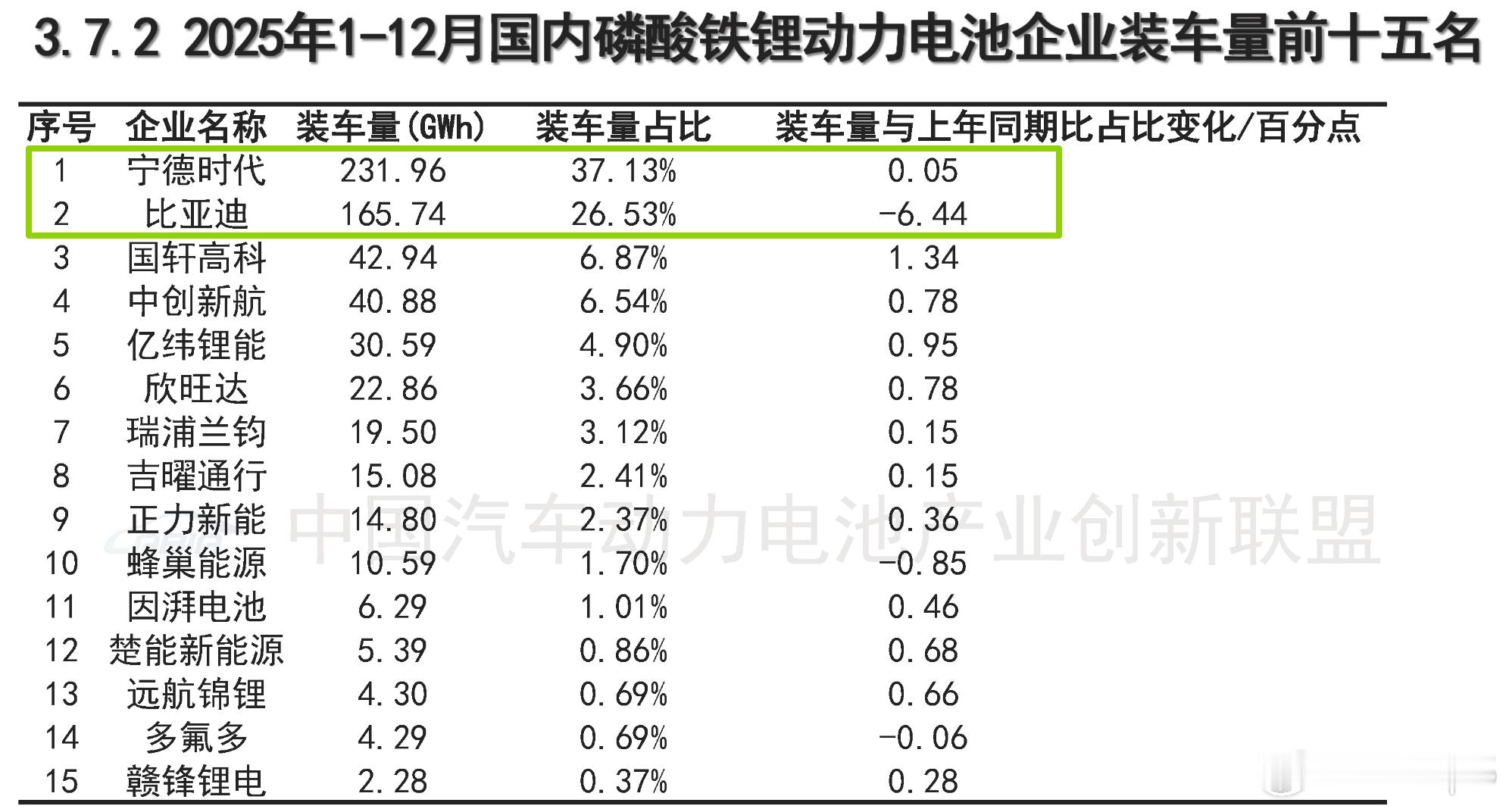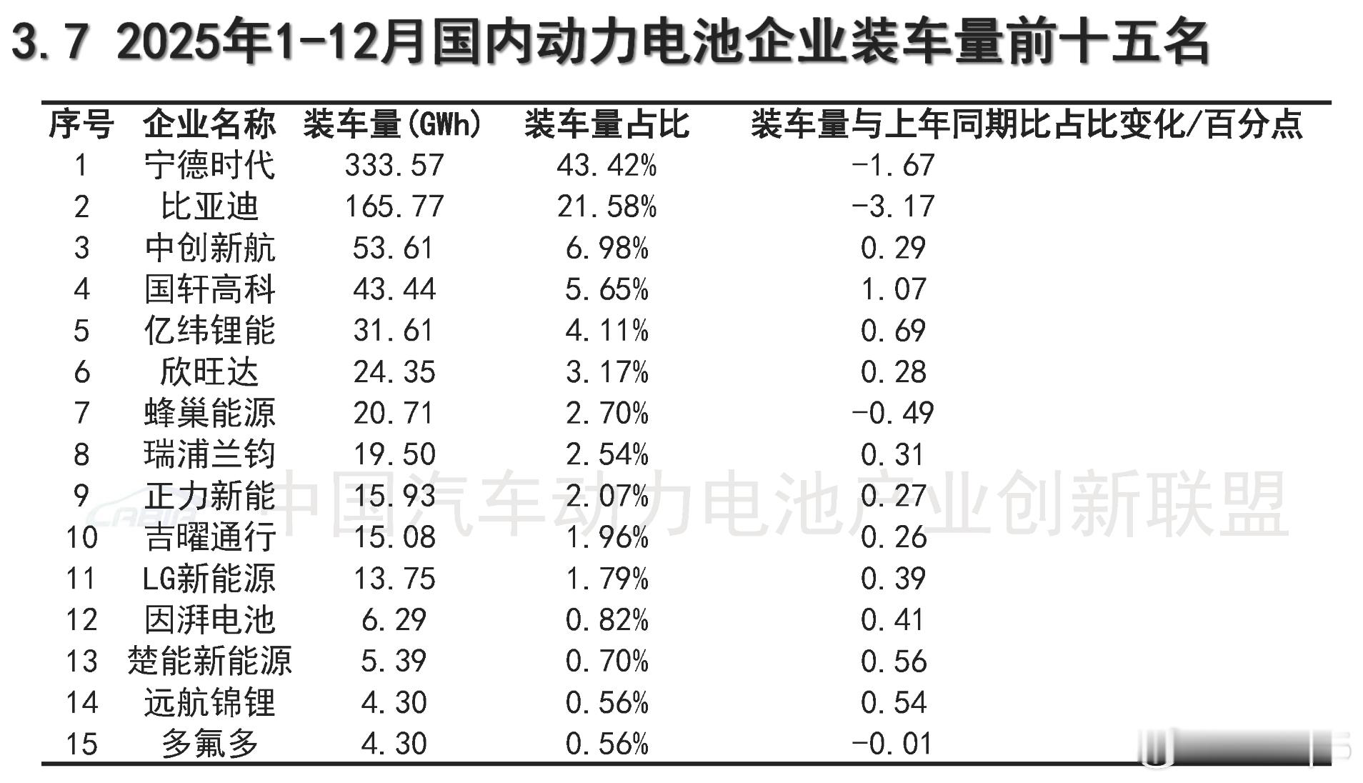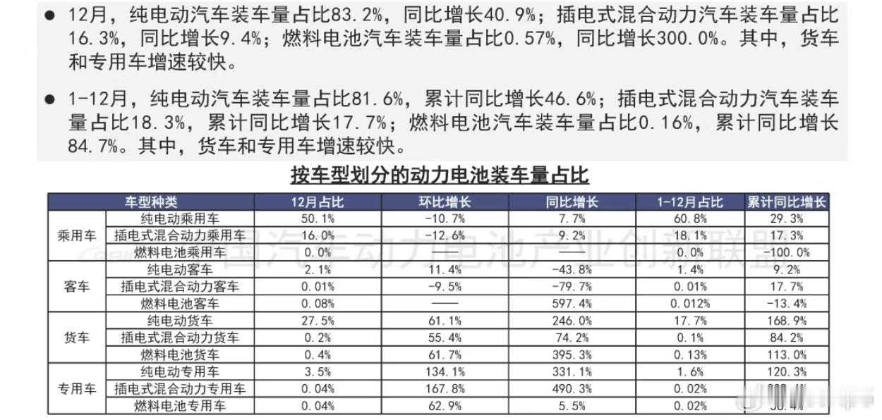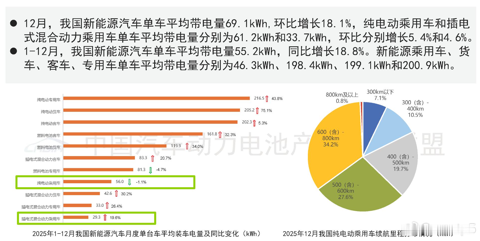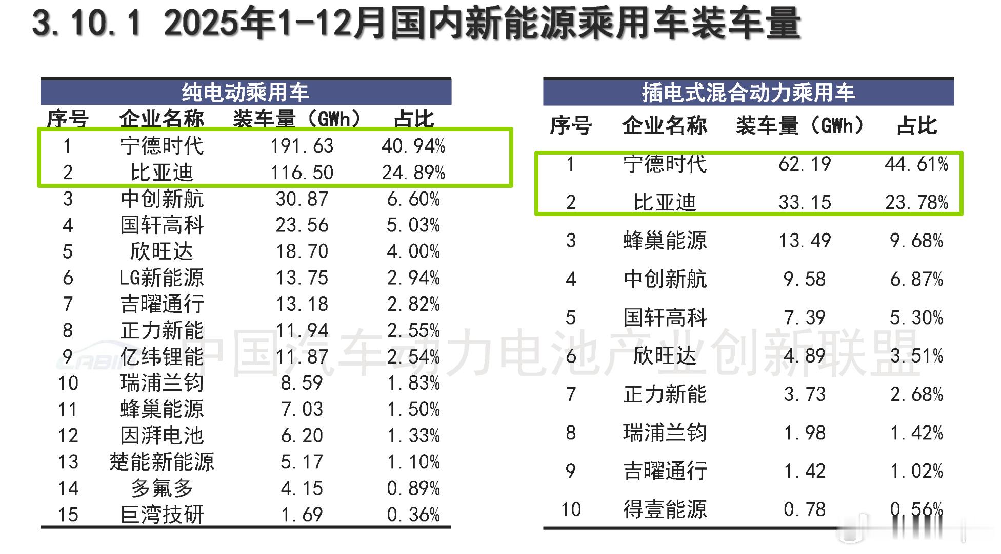 总结一下25年的国内动力电池出货数据。写在前面,动力电池包括乘用车和商用车两块,只看乘用车的没有意义。图1是全年总出货量排名,宁德时代和比亚迪仍旧是绝对的TOP2,但是份额依旧在下滑。究其原因,我个人认为还是因为在国内生产制造磷酸铁锂电池比制造三元锂容易太多了,只要有钱高低能进来分一杯。高端不行低端可以,乘用不行商用可以。图2是各类车型装车量占比,最显著的变化就是纯电货车几乎和插电混动乘用车持平了,预计26年将完全反超甚至可以逼近纯电乘用车市场规模。而纯电货车是可以和储能直接共用插箱的,这无疑给了中小型企业更多机会。图3是各种新能源车型车均电量,纯电乘用车带电量在下降,插混乘用车带电量在上涨。趋势特别明显,插混未来的趋势只有一个,带发动机的纯电。而纯电货车和专用车电池电量的增速异常高,这主要是423和600kWh电池包普及带来的。图4体现了12月纯电乘用车电池能量密度的变化,变化根源在于高端车增速明显、铁锂电池包密度升级显著。图5针对乘用车市场纯电和插混份额。图6是三元电池装机量,一家独大以及特斯拉长续航版本需求增加让LG南京工厂存在感增加。图7很好的说明了比亚迪2025年面临的一些状况,它的混动车普及大电池时间更晚,同时自己的纯电货车/重卡还没起来,所以份额有明显下滑,今年会有所好转。看完这些,我们对26年市场应该有一个初步的判断。首先就是今年的增长点更多会体现在商用车上。不说太夸张,30万辆纯电重卡就能带来130GWh装机量,这是各家必须争夺的。其次,大电池插混(含增程)不可逆,这是第二核心增长点。最后就是纯电乘用车,电池涨价应该怎么办?那必须继续加大电池,证明电池大的意义。气场全开