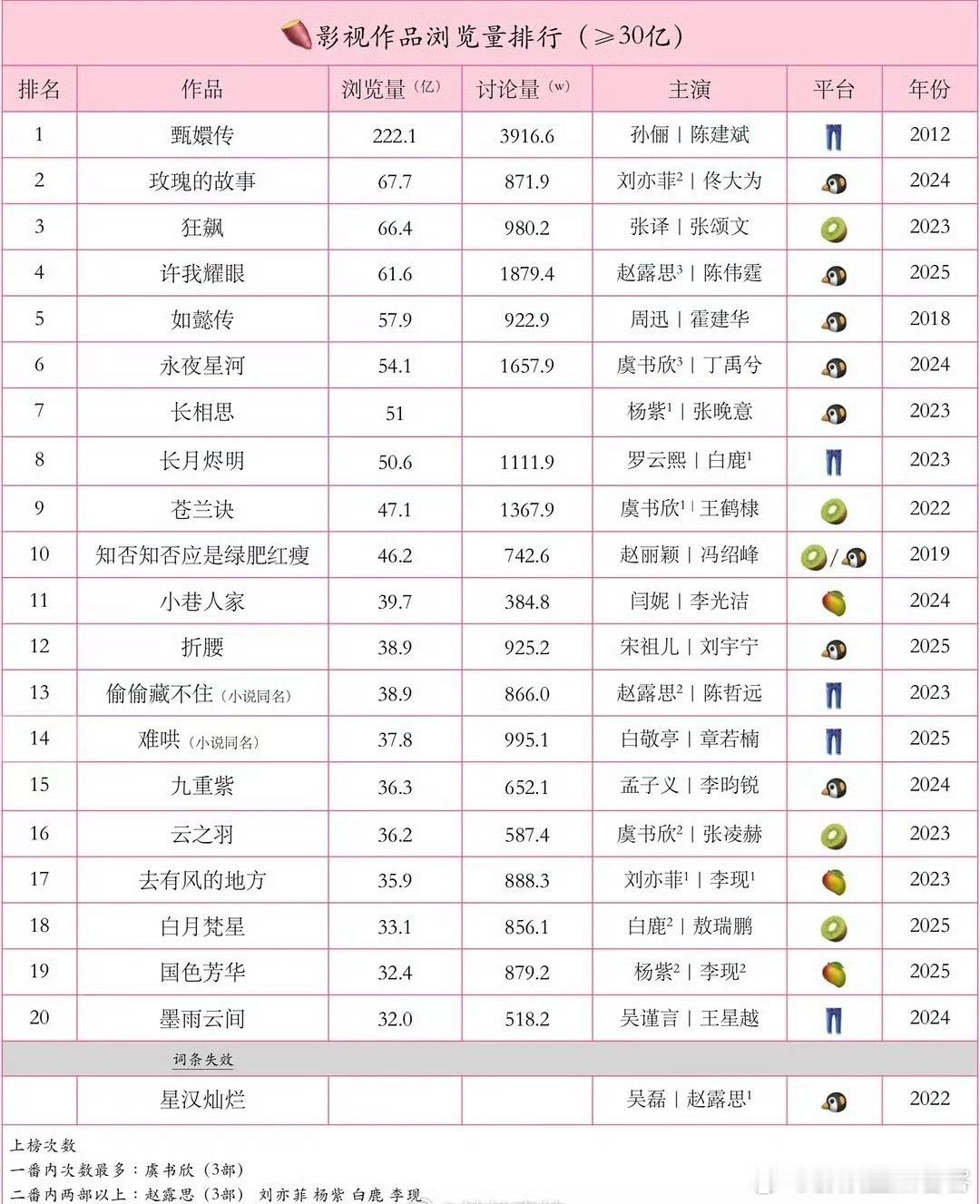 红薯电视剧作品浏览量排名刘亦菲玫瑰的故事这么🐮?