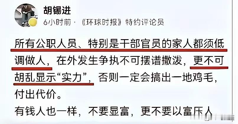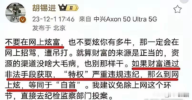 这相当于把话明说了, 老胡的担心过头了吧,作为媒体人应该忧国忧民,始终站在人民的立场,真正的为老百姓服务才对。 但是现在却担心起有权有势的群体,担心起他们的家人,担心起他们的前途,担心起他们的财富被人民发现。 因此才频繁的告诫他们不要在网络上炫富,苦口婆心的劝导,更指出这样做就等同于“自首”,真是用心良苦了。