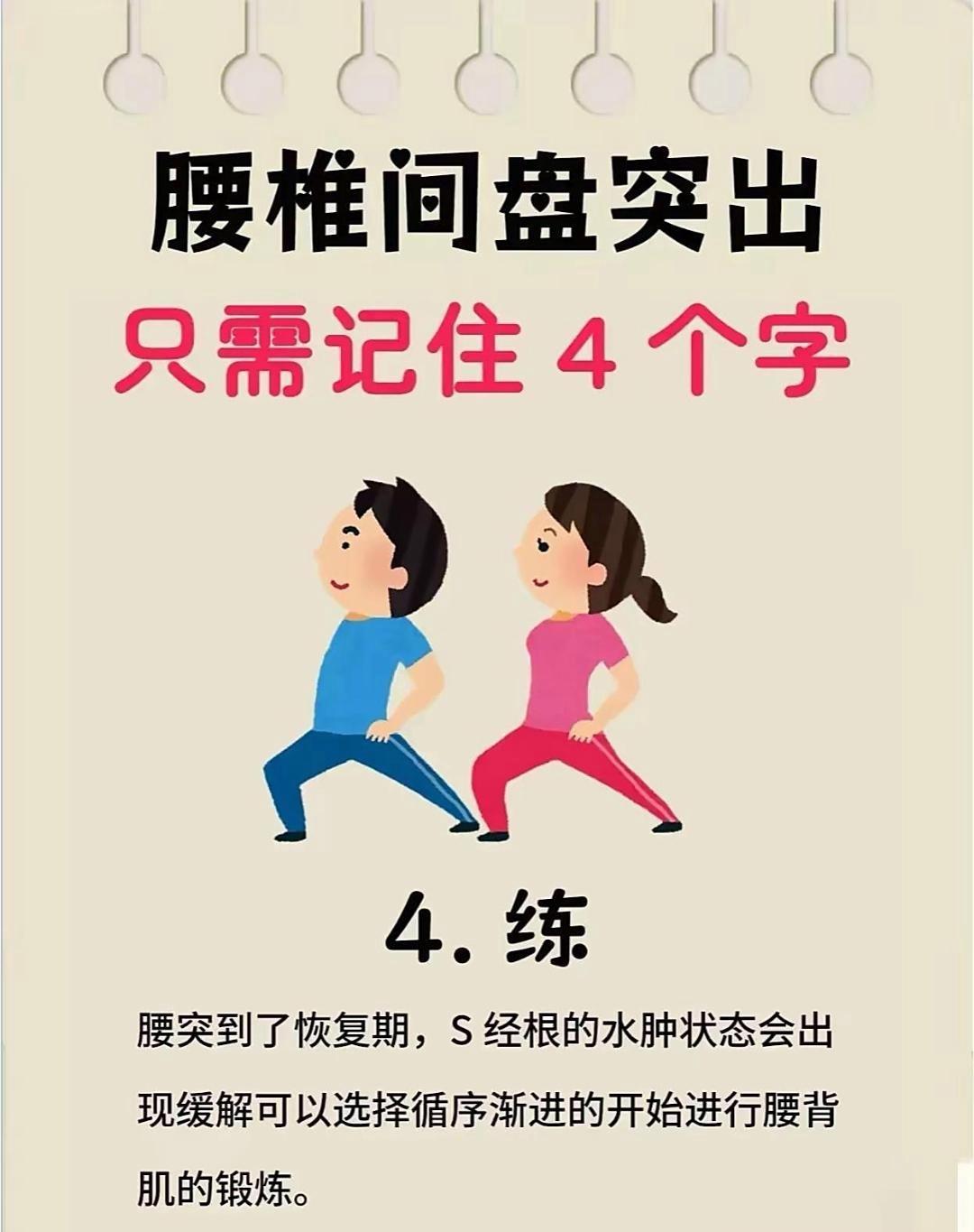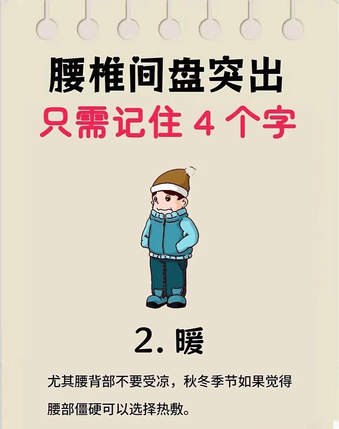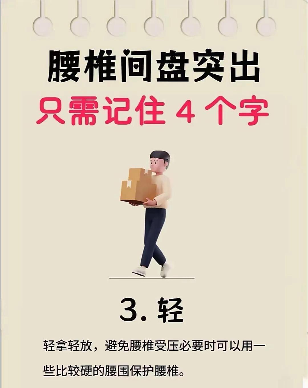 腰椎间盘突出是常见的脊柱退行性问题,无需过度焦虑,遵循“躺、暖、轻、练”四字法则做好日常护理,可有效改善不适,这一方法贴合《腰椎间盘突出症诊疗指南》中的康复护理方向。 “躺”是症状急性期的关键护理要点。发作期可卧床休息1-2天,选择软硬适中的床垫,让腰椎保持自然生理曲度,降低椎间盘承受的负荷。需注意避免长时间卧床不动,每日定时翻身活动,防止腰背肌肉力量减弱。 “暖”能帮助舒缓腰背肌肉紧张。腰部受凉易导致局部血液循环不畅,加重不适症状。日常要做好腰部保暖,避免冷风直吹,急性期可用温毛巾热敷腰部,每次15至20分钟,助力放松肌肉、缓解不适感。 “轻”是日常防护的核心原则。避免弯腰搬重物、久坐久站等伤腰行为,搬取物品时用腿部发力替代腰部,久坐每40分钟起身活动片刻。若需用护腰辅助,不宜长期佩戴,以免形成依赖、削弱腰肌力量。 “练”需循序渐进、量力而行。恢复期可在专业康复人员指导下,开展五点支撑、小燕飞等核心肌群训练,增强腰背肌对腰椎的支撑力。切勿盲目拉伸或进行高强度运动,避免加重腰部负担。 若不适症状持续加重,需及时就医做进一步评估调理。