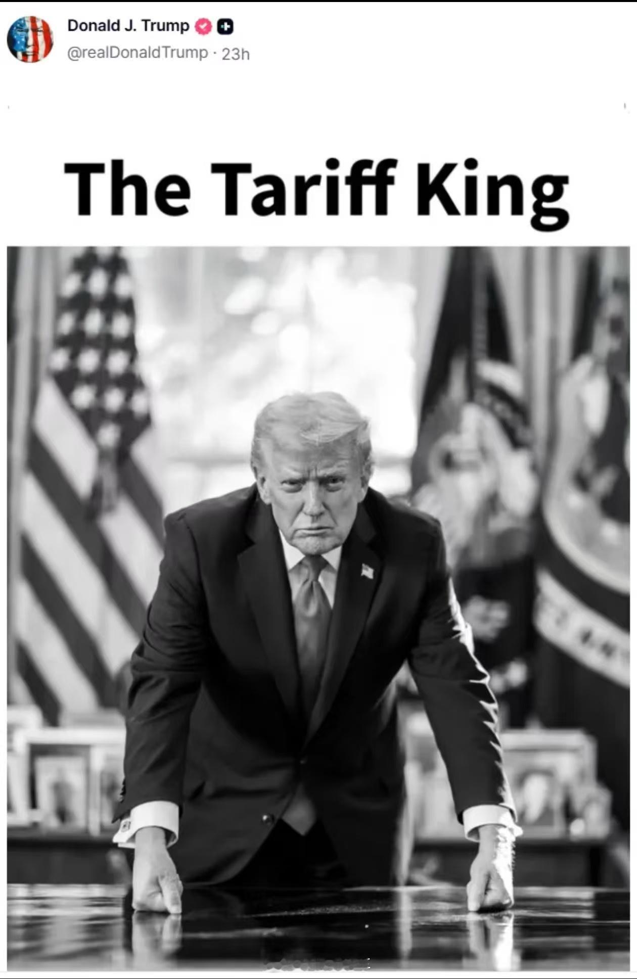 特朗普发布个人黑白照片,自封“关税之王”西半球大王,请继续你的表演