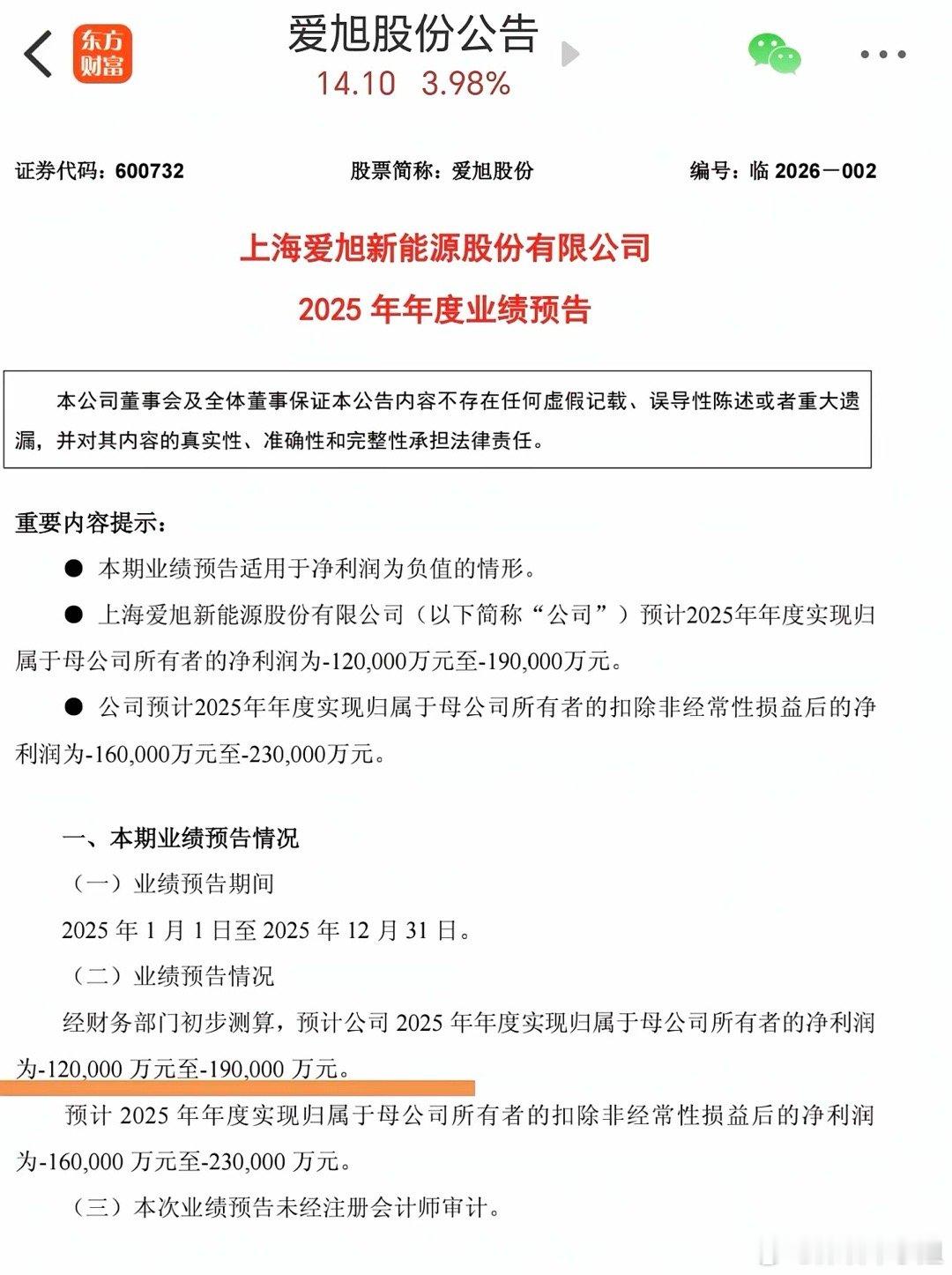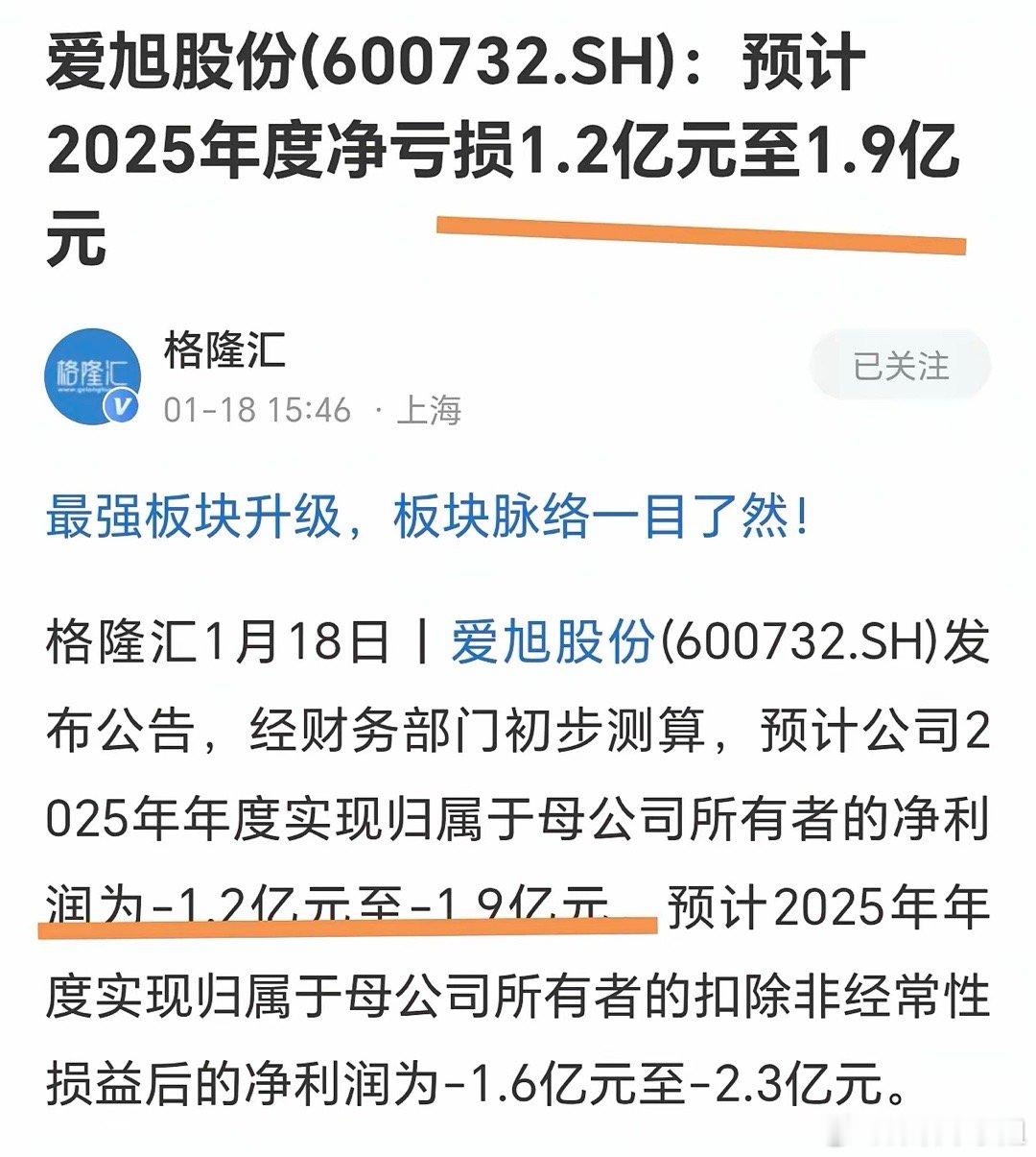 这么粗心大意发布信息,太不负责了!下午3点46分,格隆汇发布爱旭股份公告25年度亏损1.2亿~1.9亿;而东方财富发布上市公司公告:爱旭股份公告25年度亏损12亿~19亿!一个小数点,相差10倍!前者投资人就要大幅度买入,光伏业绩大幅度扭亏,太亮眼了!后者就要谨慎,光伏寒冬继续!