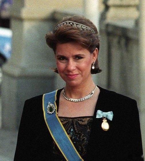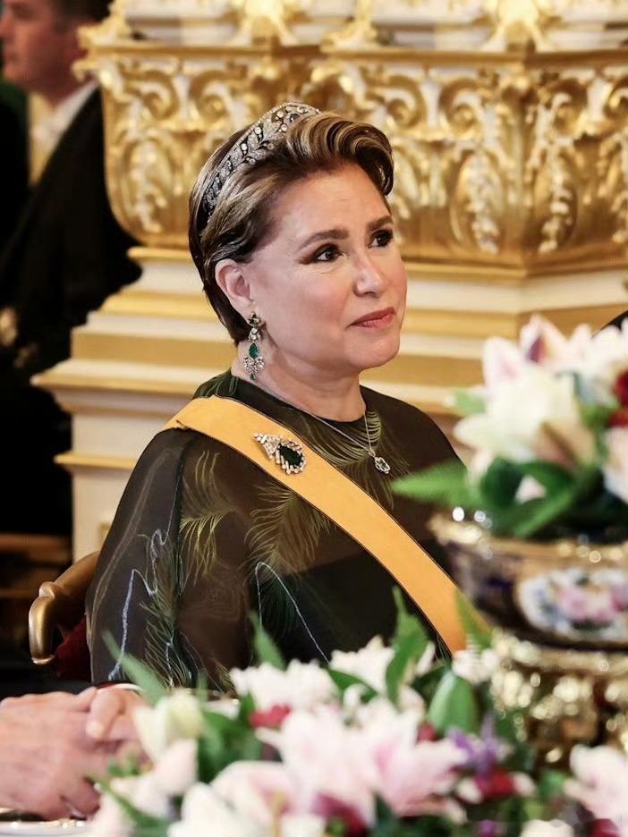 珠宝 卢森堡大公夫人玛丽亚·特蕾莎的祖母绿钻石胸针,Art Deco风格(装饰艺术风格)珠宝,款式比较奇特像是叶片造型,胸针中间悬挂着硕大的梨形祖母绿吊坠,体量不小非常显眼,挂在衣领上比扣在绶带上更合适。胸针的具体来源不明,从时间线来看,玛丽亚·特蕾莎自年轻起就开始佩戴,应该是属于她的私人珠宝,而且她也挺喜欢的,时不时拿出来戴一下,玛丽亚·特蕾莎毕竟是富家女出身,各种零碎私货不少。