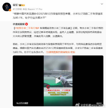 雷军:小米SU7目前二手车保值率为80.1% 处于行业头部水平小米创办人、董事长兼CEO雷军今日发文:“根据中国汽车流通协会2025年12月保值率报告来看,小米SU7目前二手车保值率为80.1%,处于行业头部水平。” 转发原文:近期,有关小米二手车价格的传言引发网友热议,经过记者采访调查发现,业内人士 ...全文