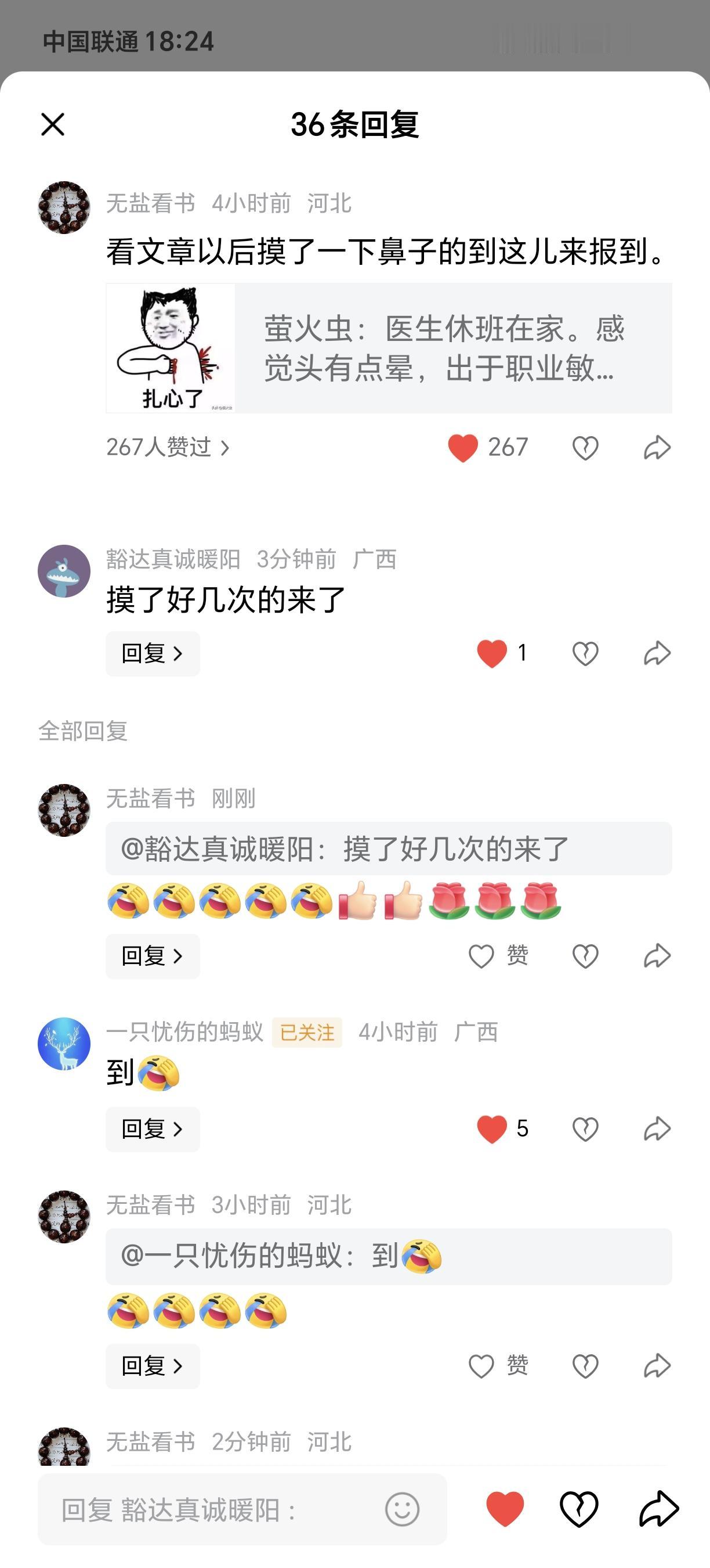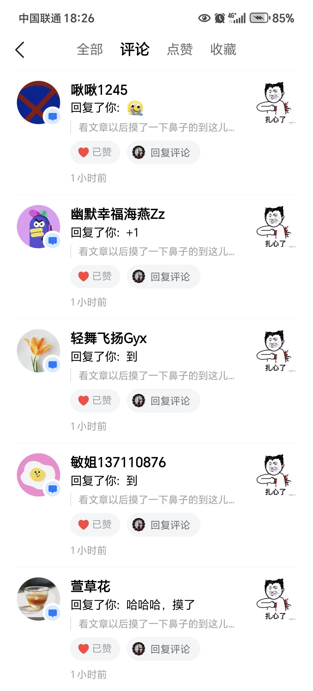 我在头条写的作品不多,获得的赞却有二十二万九千多了,我的赞都不是自己的作品收的,都是给别人家作品写评论得的。[捂脸][捂脸]我给大家用今天的例子说一下[捂脸] 今天看到有个友友发文,说是一个医生在家休假,睡醒后觉得不舒服用手摸了两下鼻子摸不到。知道坏了,可能脑梗了,赶紧打急救电话,转危为安了。 看了一个故事我下意识的摸了一下自己的鼻子。自己感到好笑,就在文章下面这评论说:摸了一下鼻子的到这儿报道[捂脸][捂脸] 没想到今天一下午我只要打开头条回复就是99+,开始我以为自己的作品爆了呢,还挺开心。点开来看。结果都是回复那条评论的,有评论直接写报道的给点赞的,热闹的不亦乐乎[捂脸] 只是我自己的作品没人理。[大笑][大笑]我一边看一边笑,就这条评论一下午给我挣了大几百个赞了,点赞的报道的还在持续增加中[大笑][大笑][大笑]