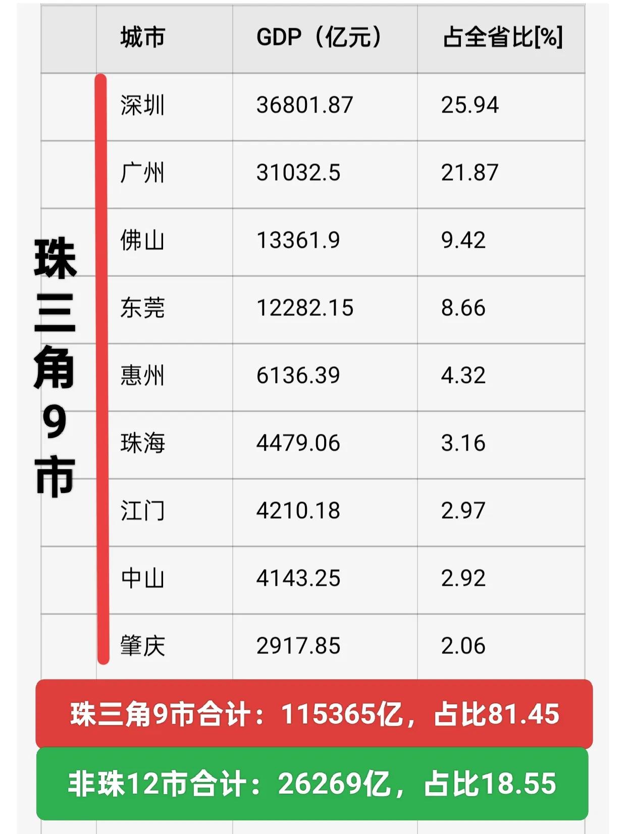 广东省珠三角地区的经济发展对广东有多重要? 珠三角地区包括深圳,广州,佛山,东莞,惠州,珠海,江门,中山,肇庆9市。广东省一共下辖21市,珠三角9市是全广东省经济发展最好,经济最活跃,发达程度最高的区域。 其中的深圳,广州市GDP更是超3万亿元,GDP总量位居全国第三,第五,是世界级一线城市。不仅是对于广东来说,对于整个国家来说这两个城市的地位都是举足轻重的。 珠三角地区的深圳,广州GDP分别为36802亿,31033亿,GDP占全省的25.94%和21.87%,两市GDP总量占比接近全省的一半了,是广东省经济发展的“双核”引擎,重中之重。 佛山,东莞是广东省的万亿城市,佛山GDP13362亿,东莞12282亿,分别占全省的9.42%和8.66%,对广东的经济发展也起到不可忽视的作用。 深广佛莞4城GDP总量占全省的三分之二,是全省GDP的重要贡献地,是全省经济发展的主要动力。珠三角其余的惠州,珠海,江门,中山,肇庆GDP占全省比重也都超过2%,虽然比不上上面几个城市,但是其经济发展也是广东省的重要组成部分。 珠三角9市GDP总量合计11.54万亿元,而全省GDP14.16万亿,珠三角地区合计GDP占全省比重为81.45%,也就是广东省超八成的GDP由珠三角地区贡献,其余的粤西,粤东,粤北地区12市合计GDP为26269亿,占全省的18.55%。 有没有发现这其余12市GDP总量合计甚至不如深圳或广州一城的GDP总量。 综合以上,珠三角地区对广东省的经济发展起着决定性的作用,全省的经济发展主要看珠三角地区,而深圳,广州更是重中之重,是全省的经济“双核”引擎。珠三角 广东gdp 广东各市排名