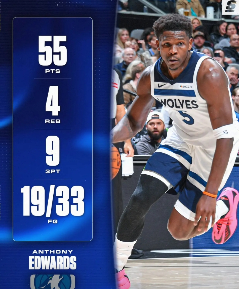 华子最近专心养伤,就是为了和马刺这一场大战,可惜最终森林狼123:126还是输了。 其实森林狼第二节就被马刺打崩了,但凭借华子单节26分的表现,把悬念留到了最后。今天华子33投19中轰下职业生涯新高55分,命中了9记三分。对面的文班也砍下39分,这组状元对决,会成为未来几年热门话题。森林狼还是要想办法补强一下,不然纯纯浪费华子的巅峰啊。