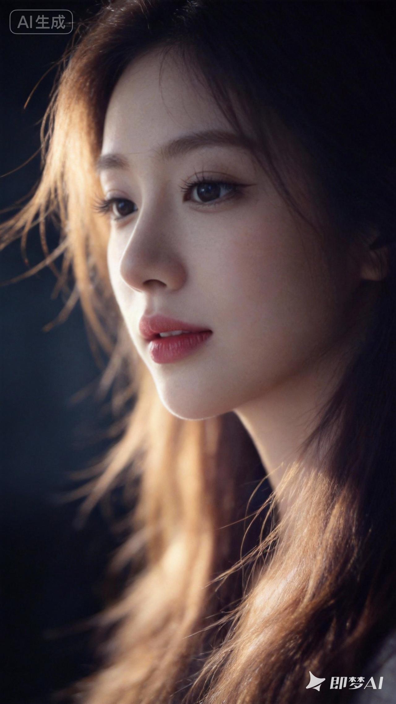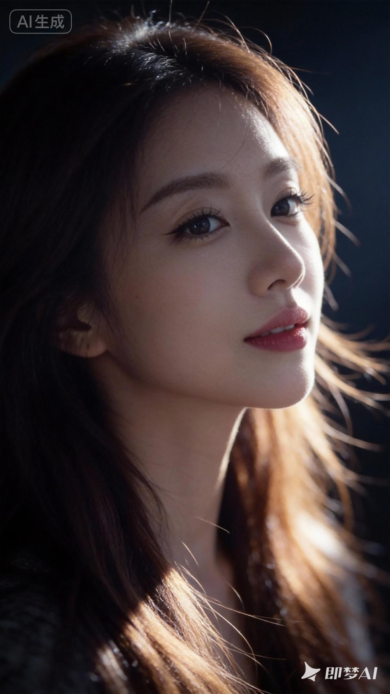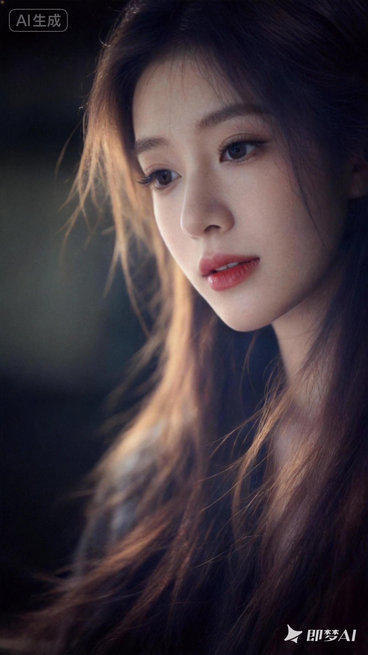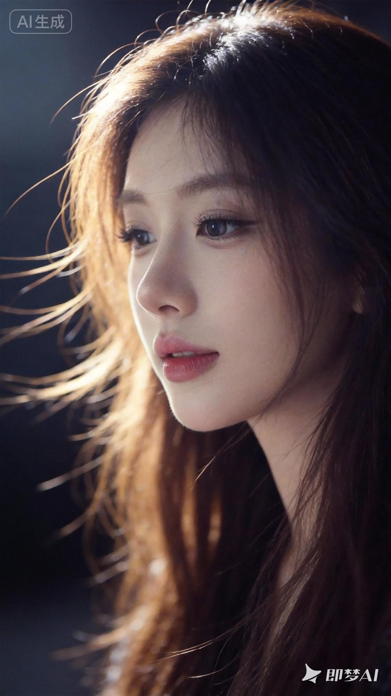 聚焦一位拥有棕色长发的东亚女性,发丝在柔光下呈现自然飘逸的动态感;妆容打造清透伪