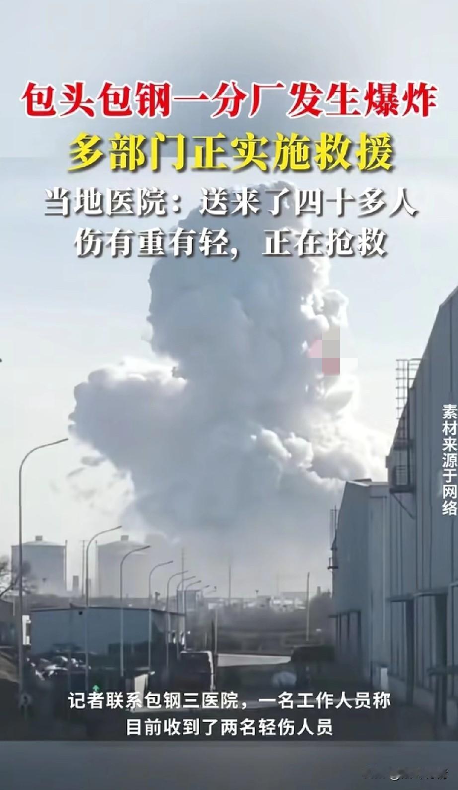 突发,内蒙古包头一分厂突发爆炸,多部门正在实施救援,周边群众感受到了明显震感! 工厂目前已经被封锁,周围生起了浓浓的白烟,蘑菇云冲天而起,厂区内部钢建筑大量坍塌! 现场救援工作紧张有序,周围不时有工人走过,救援车辆紧急出动,都想尽最快的努力将人救出! 据情人士爆料,是钢厂的炼钢转炉站发生爆炸,全没了,现场直接被夷为平地,非常惨烈! 包头医院发出的消息,已经送来了66人,受伤情况非常严重,有重有轻,正在抢救!目前全院职工都在上班! 周围居民表示许多人的家中房屋和门窗都被震碎,有村民表示,当时还以为是地震了!没想到是附近的钢厂发生了爆炸! 截止18日17时30分钟,爆炸事故造成了两人死亡,5人失联,66人送医,其中三人重伤! 希望这些受伤人员能够被救治妥当,毕竟 66人背后是66个家庭,希望他们一切安好! 内蒙古 内蒙古大爆炸