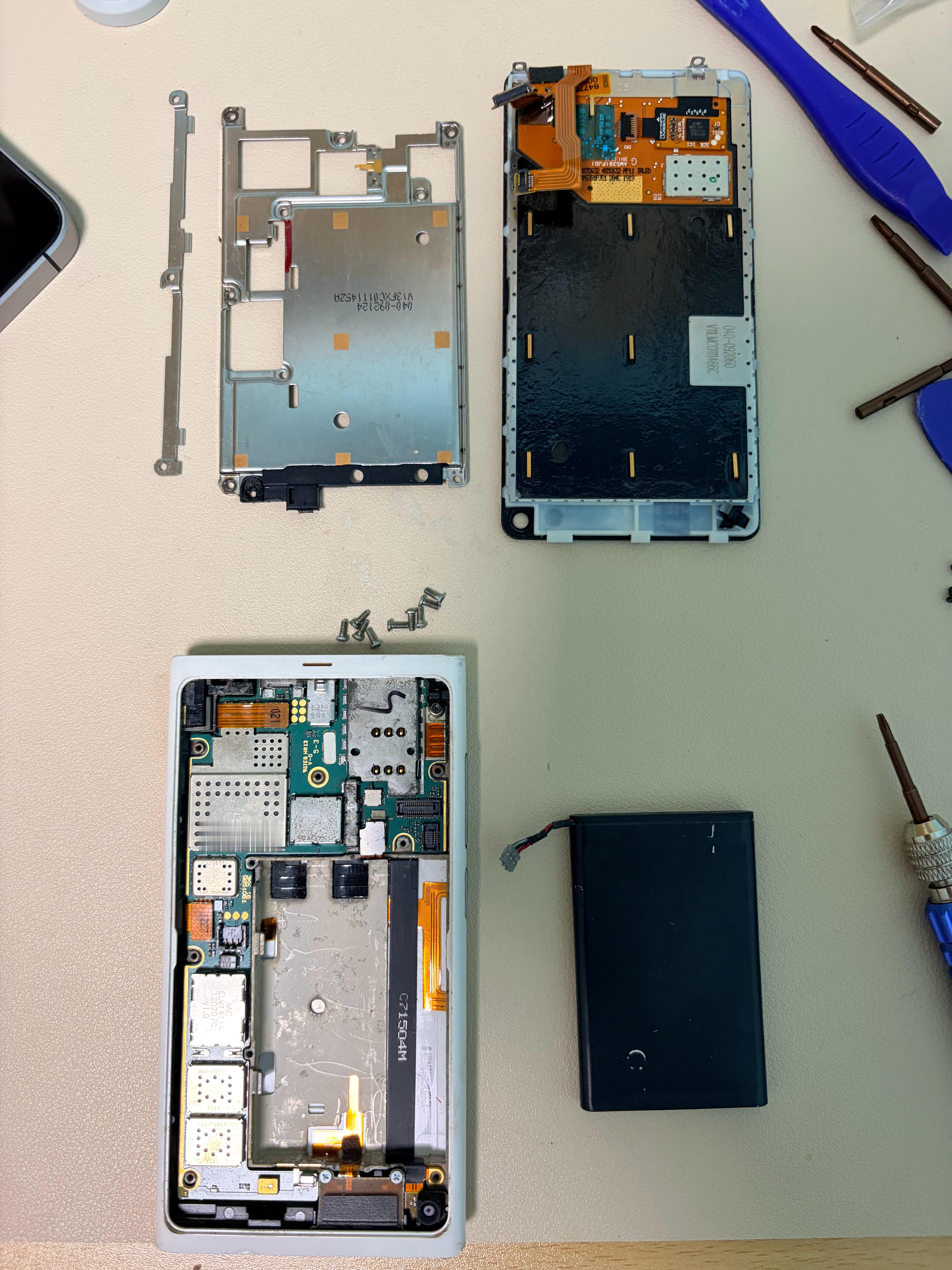以前的手机不防水,拆起来可太轻松了,两颗螺丝一拧,屏幕就撬开了。不过看这个诺基亚 N9 电池好像没鼓包,但还是决定扔掉电池,只留其他东西装起来当个摆件。