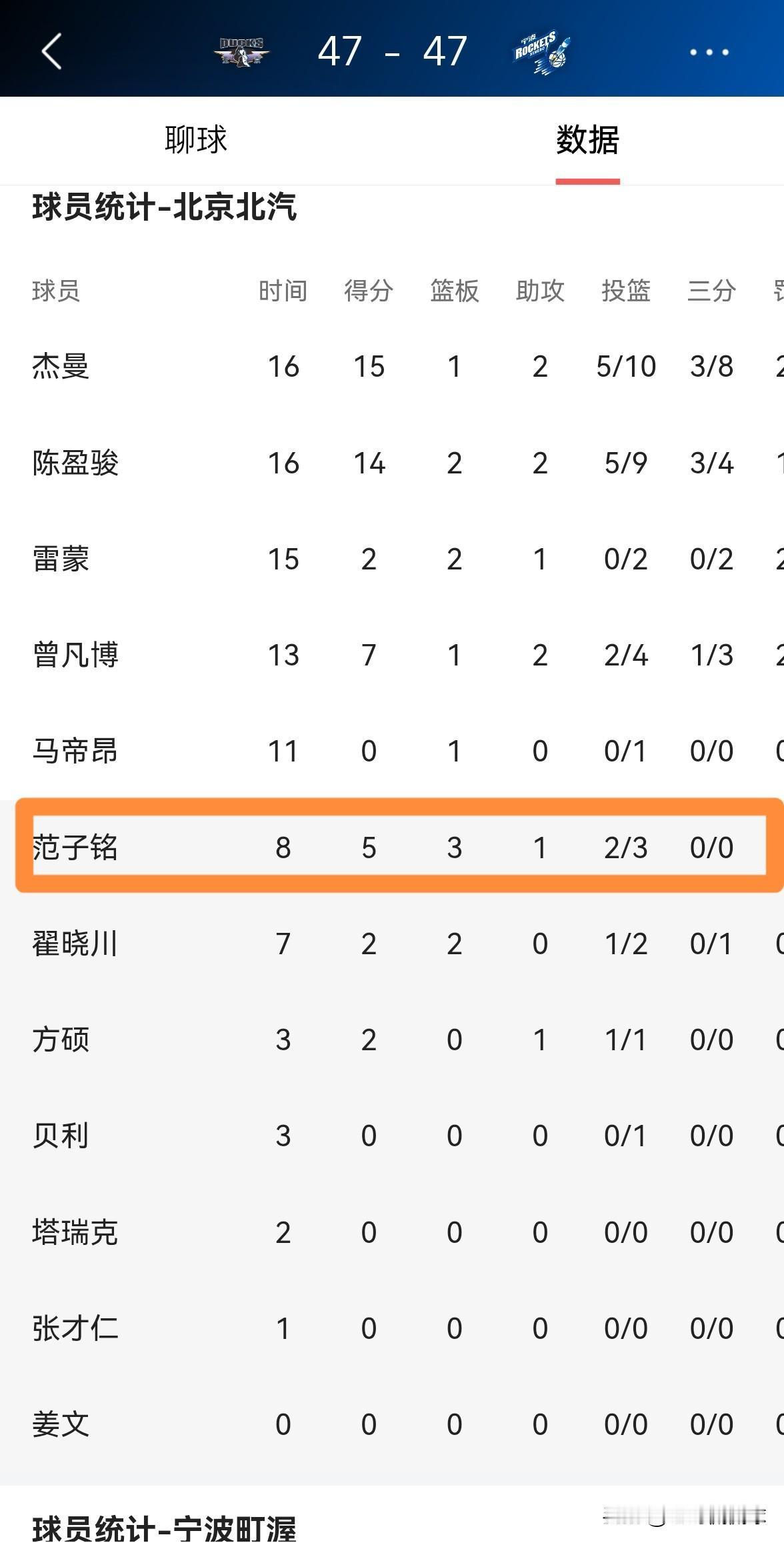 北京北汽大将范子铭真是名副其实的拼命三郎!在今天北京北汽主场迎战宁波町渥的上半场比赛中,目前双方半场战罢战成了47平。在前两节比赛中,范子铭替补出战8分钟,投篮3中2,其中罚球1中1得到5分,还有3篮板1助攻,他的场上正负值为全队最高的+10。 尽管范子铭在场上容易犯错和出现犯规的情况,但是只要他上场,他就像打了鸡血一样充满活力,无论是在进攻端还是在防守端,范子铭都活力四射、拼劲十足。