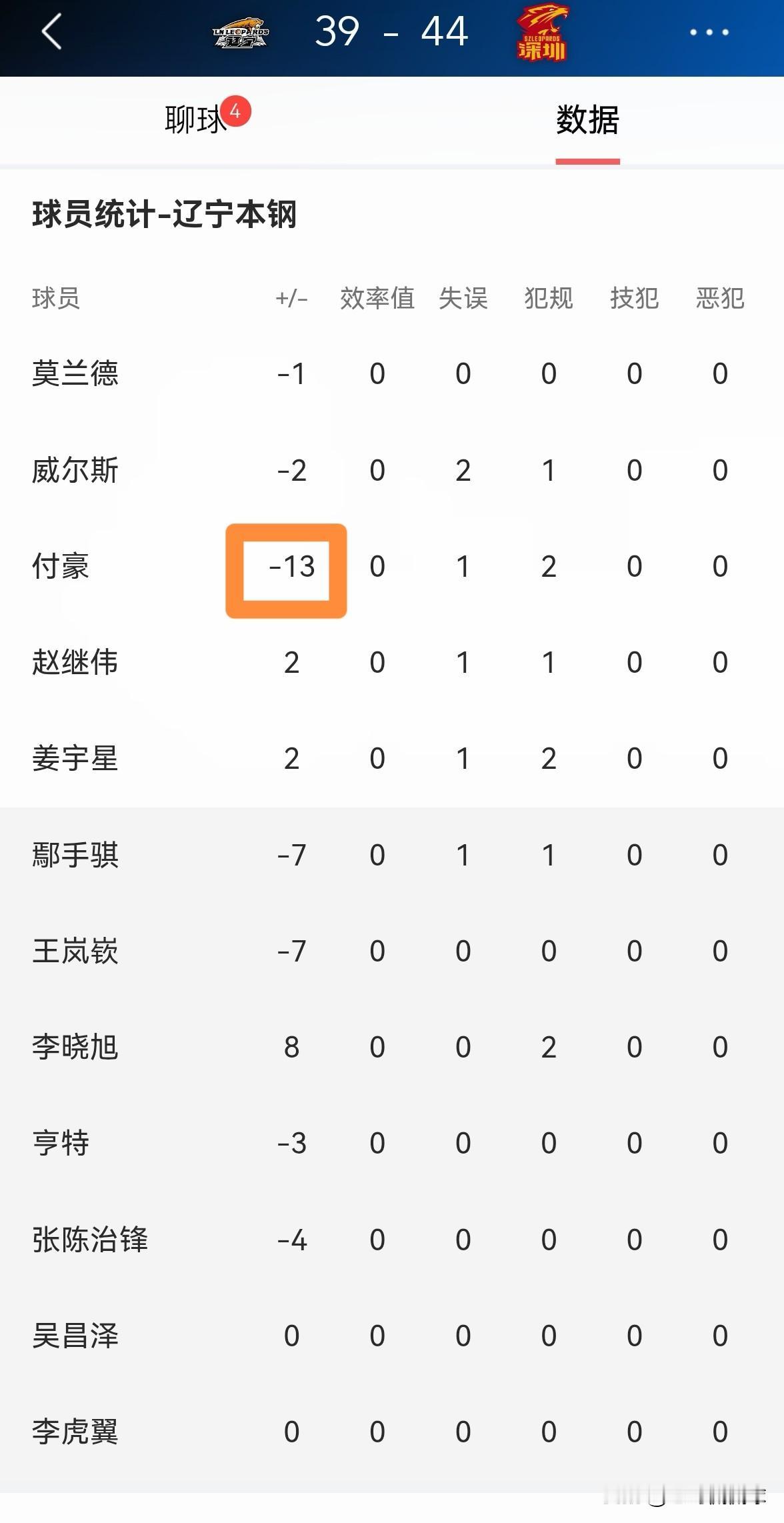 辽宁本钢球星付豪真是太让人费解了!在今天辽宁本钢主场迎战深圳马可波罗的比赛中,目前双方的上半场比赛已经结束,辽宁本钢以39:44落后于对手。让人感到特别费解的是,付豪在上半场比赛中首发出战14分钟,投篮5中4,其中三分球1中0、罚球2中2非常高效的砍下10分3篮板,但是他的场上正负值却是全队最低的-13。 对于这种情况我真是百思不得其解,难道付豪在场上只进攻不防守吗?