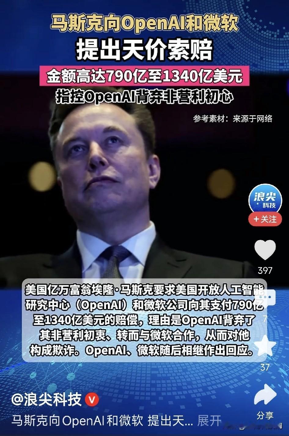 2026开年科技圈最大瓜来了,马斯克1340亿索赔+收购航空,惊呆所有人! 马斯克的行为常常出人意料。一边甩1340亿美元天价诉状,把亲手创办的OpenAI和微软告上法庭;一边跟欧洲廉价航空CEO隔空互怼,直言“收购是好主意”,全网都在喊他“疯批”,但这波操作根本不是冲动。 先说告OpenAI这件事。当年马斯克掏了3800万美元当“创始大哥”(占早期融资60%),联合创立OpenAI,初衷是“开源、非营利,为全人类做AI”。可如今,OpenAI估值飙到5000亿美元,成了微软持股27%的“商业巨头”,早已偏离最初的轨道。 马斯克的7000亿身家,真缺这1340亿?当然不。这更像一场“撕破脸”的控诉:你拿了我的启动资金、借了我的公信力,却把公益承诺当废纸,转头成了资本的赚钱工具。他要的从来不是赔偿,而是给AI行业敲警钟——技术可以商业化,但不能背叛底层信仰。 再看要收购航空这件事,更像大佬式较真。就因为对方CEO说星链设备费油、不愿安装,还骂他“蠢货”,马斯克直接回怼要收购换人。说白了就是商业争执升级成了“不服就买下来”,既有推广星链的算盘,也有大佬不愿丢面子的成分,跟我们普通人吵架说“这店我包了”一个逻辑,就是他真有这实力。 很多人觉得马斯克爱折腾,其实他的每步操作都没脱离“利益”和“原则”。告OpenAI是护着当初的承诺,怼航空是推进自己的业务,看似疯癫实则清醒。 大佬的世界果然不一样,能用钱解决的争执绝不废话,能用法律维权的绝不忍气吞声。你觉得这两波操作里,马斯克最后能成一个吗?(图片来源于网络,侵删)
