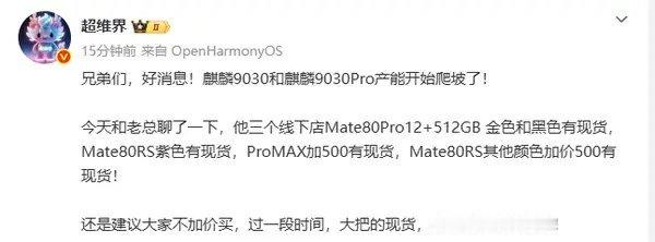 【博主:华为Mate 80缺货现状即将改善 产能开始爬坡】华为发布新款旗舰华为Mate 80系列,包含Mate 80、Mate 80 Pro、Mate 80 Pro Max及Mate 80 RS非凡大师四款机型。开售后,华为Mate 80系列热度持续高涨,出现了供不应求和加价购买的情况。有数码博主透露,华为Mate 80系列所采用的麒麟9030和麒麟9030 Pro两款芯片的产能开始爬坡,华为Mate 80系列的缺货情况即将得到改善。据透露,当前在线下渠道,华为Mate 80 Pro和华为Mate 80 RS部分版本已经实现了现货供应,华为Mate 80 Pro Max等部分机型仍然需要加价购买。而华为官方商城显示,华为Mate 80 Pro和华为Mate 80 Pro Max等机型虽然可以下单,但预计发货时间为2026年2月8日。作为最新旗舰,华为Mate 80系列全系搭载鸿蒙6操作系统,配备1.5K双层OLED直屏,支持第二代红枫原色技术,配备5750mAh-6000mAh电池,支持100W快充,高配机型采用1英寸大底传感器,支持10档物理可变光圈。