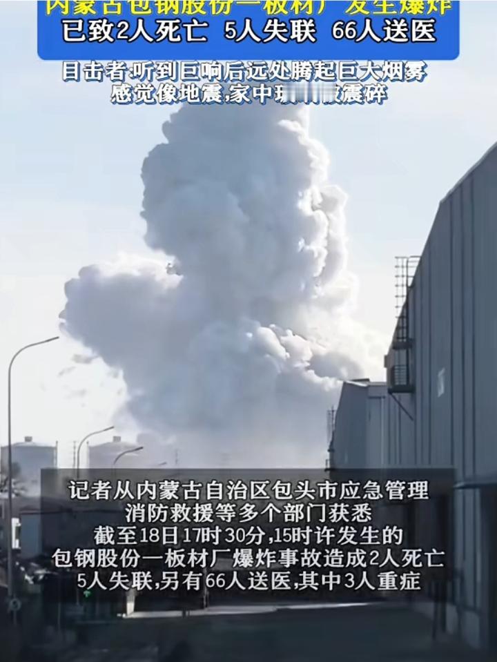 包钢爆炸致2死5失联66人送医 2026年1月18日,今天下午三点左右,一场突如其来的灾难在内蒙古包头市九原区尔甲亥村的包钢股份一板材厂发生爆炸事件。这起事故引发了公众的广泛关注,也再次敲响了工业安全的警钟。 通过手机3D卫星地图,我们可以清晰地看到事故发生地点的地理位置——这里是包钢集团的重要生产基地之一。作为国内大型钢铁企业的核心厂区,安全生产一直是企业和相关部门重点关注的问题。然而,这次突发的爆炸事件,仍然让人感受到工业安全的巨大挑战。 据官方最新通报,事故已经造成2人不幸遇难,5人失联,另外有66人被紧急送往医院治疗,其中三人情况危重。事故现场的惨烈程度,从多段现场视频中可见一斑:一股巨大的火球伴随着浓浓的黑烟直冲云霄,现场甚至升起了象征巨大爆炸威力的蘑菇云。这种场面令人震撼,也令人心生恐惧。 这次爆炸的影响范围极广,不仅仅是爆炸点本身。冲击波在瞬间席卷周围地区,造成了明显的震感,许多商铺的玻璃被震碎,居民的日常生活受到了严重影响。事故的波及范围之广,充分彰显了这次事件的破坏力和危险性。 值得关注的是,事故发生在一个高风险的工业区域。钢铁生产厂区本身就是一个高温、高危的特殊场所,存在熔融金属、易燃气体和高压设备等多种潜在危险因素。据官方初步调查,这是一场生产安全事故,相关部门已调集多支专业救援队伍全力展开搜救工作。救援现场紧张而有序,试图尽快找到失联人员,控制事态发展。 回顾过去,包钢厂区曾多次发生严重的安全事故,这也暴露出企业在安全管理方面仍存在一些隐患与漏洞。这不仅反映出工业安全的复杂性,也凸显了长期以来安全监管和落实的难题。为了防止类似事故再次发生,相关部门和企业都在持续加强安全措施,完善应急预案,确保工人和周边居民的生命安全。 目前,所有救援力量正全力以赴,搜寻失联人员,调查事故原因,统计伤亡和财产损失。虽然具体的事故原因还在调查中,但大家共同的心愿是,希望这次事故不要再造成更严重的人员伤亡,也希望受伤者早日康复。 在这个特殊的日子里,让我们共同为遇难者默哀,为伤者祈福。也希望相关部门能吸取教训,加强安全管理,杜绝类似悲剧的再次发生。工业的繁荣离不开安全的保障,只有每一个环节都做到严密、责任到位,才能真正守护好每一位工人和居民的生命安全。让我们携手努力,共同期待一个更加安全、更加美好的未来。 安全第一 包钢集团