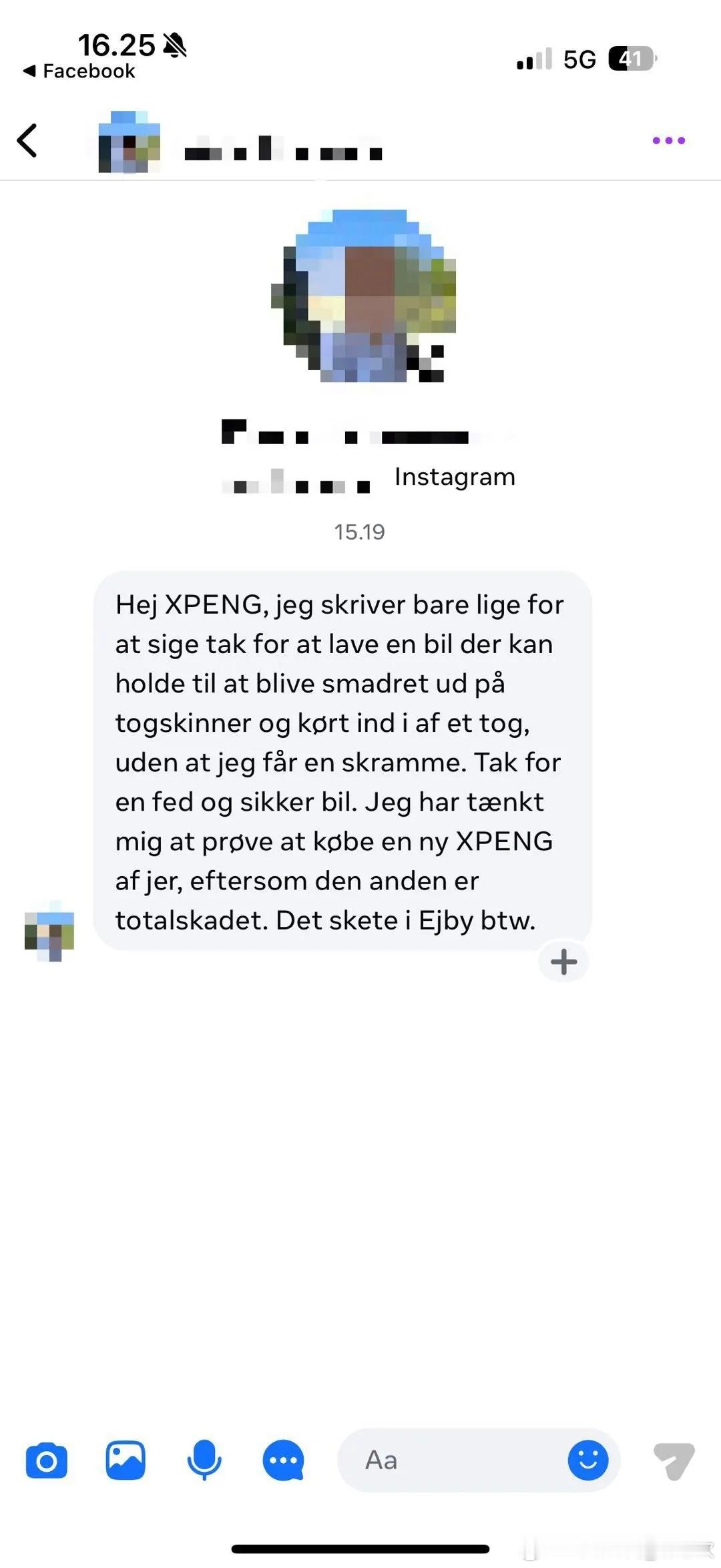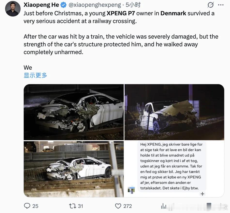 丹麦小鹏P7被火车撞报废前有小鹏G6以色列扛导弹,现有小鹏P7在丹麦扛住了被火车撞,车主几乎毫发未伤。小鹏在海外战绩又添一笔。前段时间一台小鹏P7在丹麦遭受火车撞击,虽然车头和车尾受损严重,但是乘员舱依旧保持完整,这种撞击强度下,电池结构也保证了安全没有起火,车主几乎毫发未伤。车主事后还给官方写了感谢信图4,表示P7虽然报废了但是救了他的命,以后还买小鹏的车。大v聊车小鹏p7