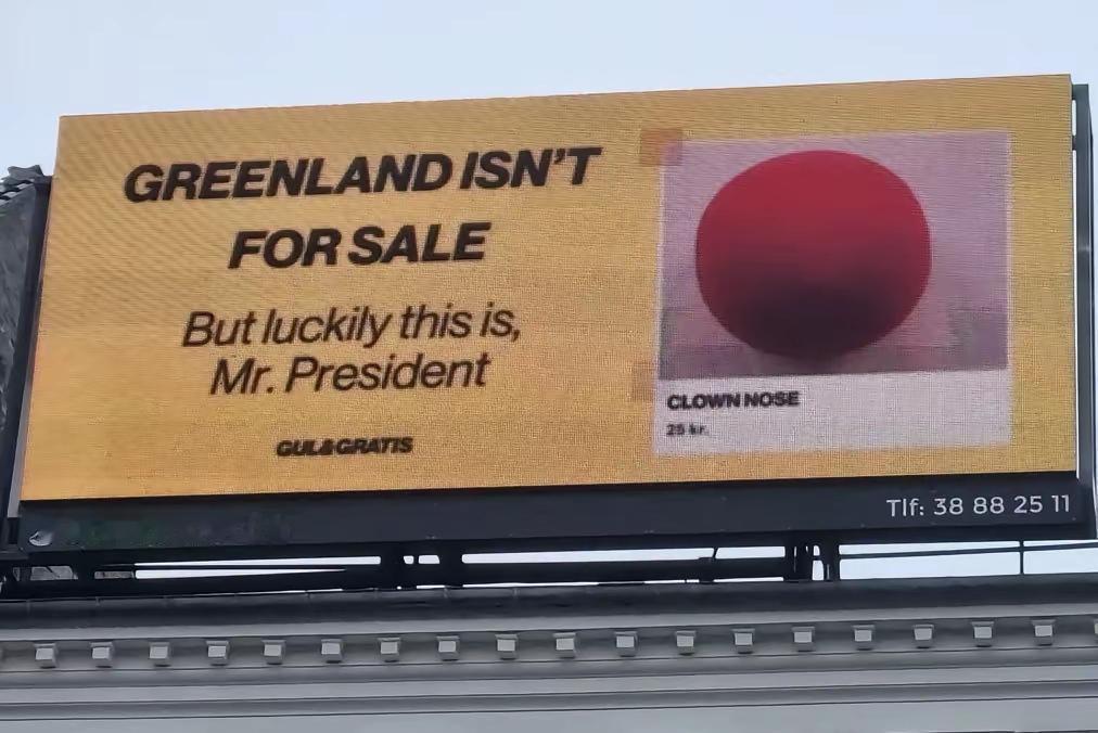 丹麦人用幽默反击特朗普夺岛! 到底是童话的故乡。都到了什么时候了,丹麦人居然还能幽默得出来。 面对特朗普咄咄逼人的夺取格陵兰岛的势头,丹麦人再一次显示出他们的幽默。他们在丹麦首都矗立起巨大的广告牌,牌子上的图片是一个马戏团小丑的鼻子,配文是::“格陵兰岛不卖。幸运的是,这东西(小丑的鼻子)有售。总统先生”。图一二。 显然,这是来讽刺特朗普的,讽刺特朗普是个马戏团小丑🤡。这本身但是挺幽默。 此前,欧洲人还幽了一默:七个国家派出了37人的“庞大军团”,以北极司令部的名义进行军事演习,而且还邀请美国参加。使用狗拉雪橇、邀请美军来抵抗美军? 但是,再看看格陵兰岛外交部长维维安,在美国白宫西翼内外抽烟哭鼻子就知道他的压力了。谈判并没有改变特朗普的主意,她一边流着泪一边说:“那种持续增加的压力,真的让我感到情绪激动,难以承受这种压倒性的窒息感。”图三四。 尽管丹麦人很是幽默,但是幽默解决不了问题;维维安的眼泪解决不了问题,特朗普不相信眼泪!