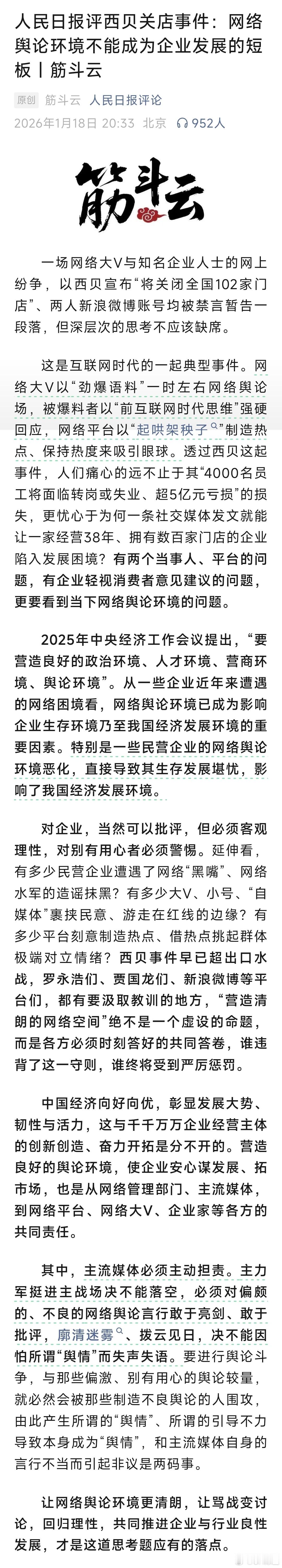 《人民日报评西贝关店事件:网络舆论环境不能成为企业发展的短板》这篇文章虽短,但是一针见血,问题在哪,已经非常清楚了。▷ 网络大V以“劲爆语料”一时左右网络舆论场,被爆料者以“前互联网时代思维”强硬回应,网络平台以“起哄架秧子”制造热点、保持热度来吸引眼球。▷ 对企业,当然可以批评,但必须客观理性,对别有用心者必须警惕。延伸看,有多少民营企业遭遇了网络“黑嘴”、网络水军的造谣抹黑?有多少大V、小号、“自媒体”裹挟民意、游走在红线的边缘?有多少平台刻意制造热点、借热点挑起群体极端对立情绪?▷ 主流媒体必须主动担责。主力军挺进主战场决不能落空,必须对偏颇的、不良的网络舆论言行敢于亮剑、敢于批评,廓清迷雾、拨云见日,决不能因怕所谓“舆情”而失声失语。