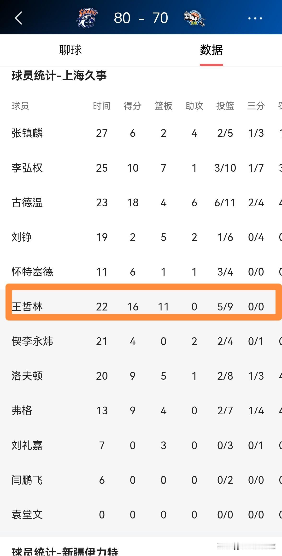 上海久事当家中锋王哲林真是太强硬了!在今天上海久事主场以80:70力克新疆伊犁特的比赛中,王哲林在篮下展现出了超强的侵略性,他在替补出战的22分钟里,投篮9中5,其中罚球6中6非常高效的砍下16分11篮板1盖帽,他的场上正负值为全队最高的+21。 毫不夸张的说,上海久事之所以能够赢下本场比赛,王哲林堪称头号功臣,他在攻防两端都为全队提供了巨大的帮助。