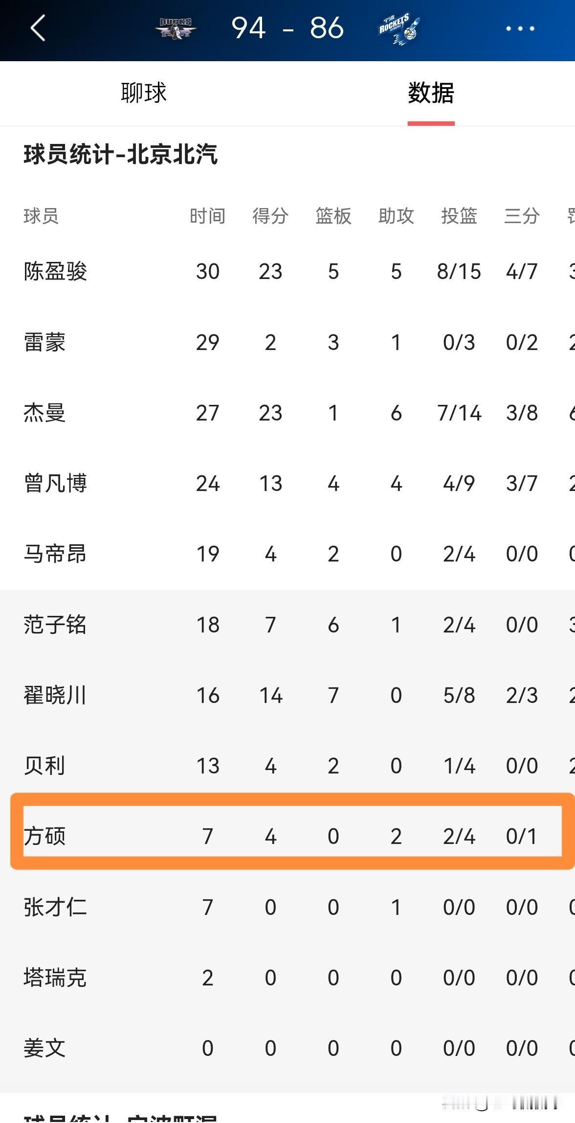 我强烈呼吁北京北汽主帅许利民增加方硕的上场时间!在今天北京北汽主场以94:86战胜宁波町渥的比赛中,老将方硕替补出战7分钟,投篮4中2,其中三分球1中0得到4分2助攻,他的场上正负值为+5。 老实说,以方硕目前的能力来看,他绝对值得更多的上场时间,尤其是在赵睿因伤缺阵的情况下,许利民教练应该充分发挥方硕的能力,方硕的控场能力还是值得肯定的。