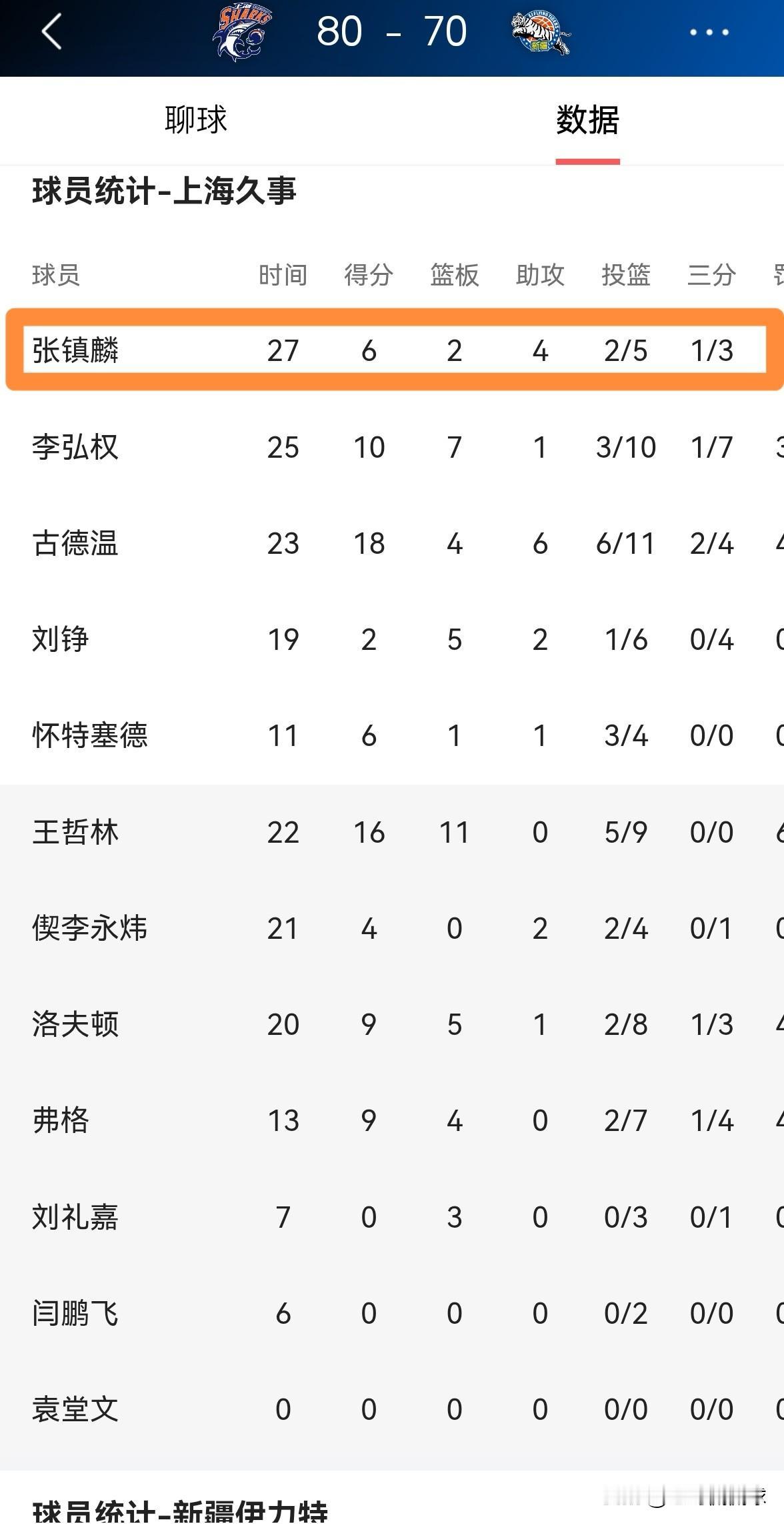 上海久事超级球星张镇麟真是太黯淡无光了!在今天上海久事主场以80:70战胜新疆伊犁特的比赛中,张镇麟在场上的存在感非常小,他在首发出战的27分钟里,投篮5中2,其中三分球3中1、罚球2中1仅仅得到6分,还有3次失误和2次犯规,他的场上正负值为+3。 坦白说,本场比赛张镇麟完全没有打出应有的表现,要知道张镇麟可是一名顶薪球员。