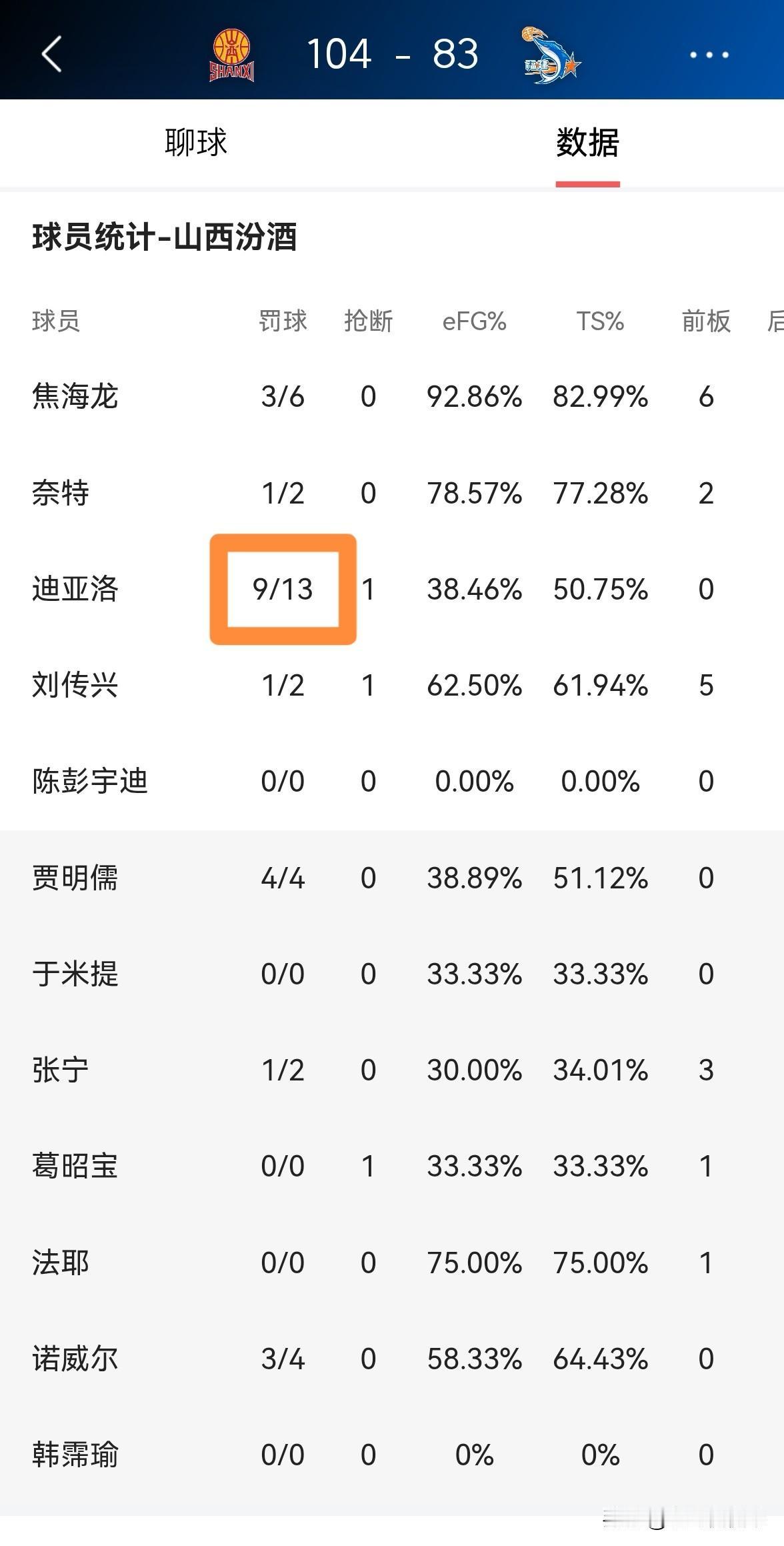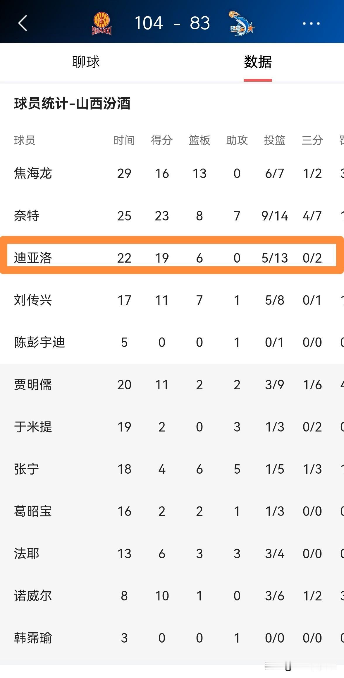 山西汾酒超级外援迪亚洛真是太勇猛了!在今天山西汾酒主场以104:83大胜福建晋江文旅的比赛中,迪亚洛博得了13次罚球,展现出了超强的冲击力。 全场比赛下来,迪亚洛首发出战22分钟,投篮13中5,其中三分球2中0、罚球13中9得到19分6篮板1抢断1盖帽,他的场上正负值为+17。 让我感到纳闷的是,像迪亚洛这种冲击力十足的锋线球员,他怎么会惨遭NBA的淘汰?在我看来,以迪亚洛的能力来看,他绝对能够在一些实力较弱的NBA球队站稳脚跟。