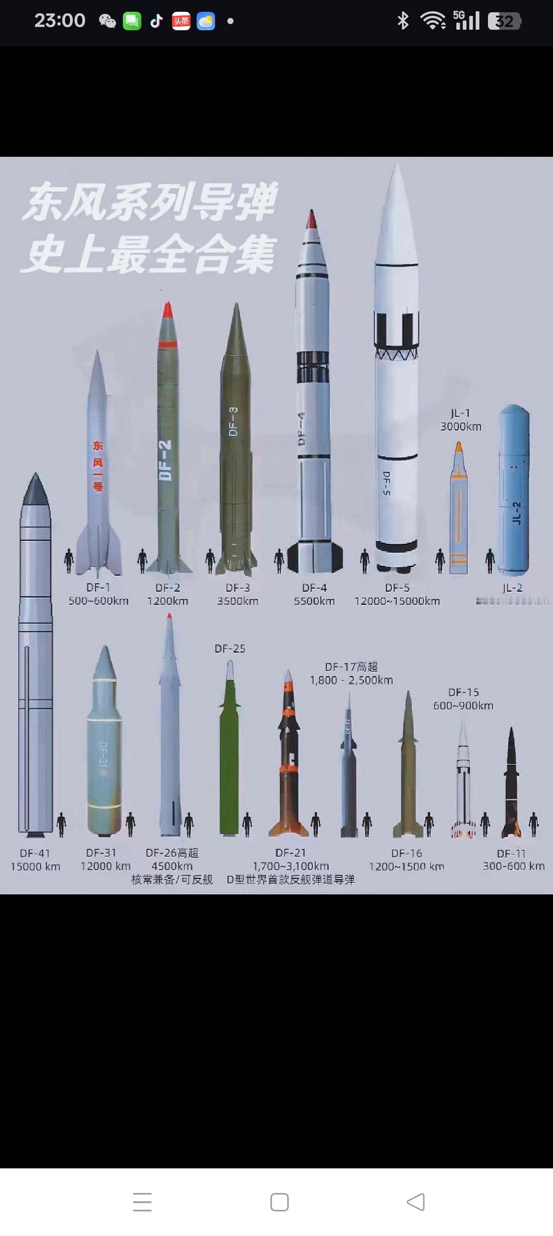 中国导弹万花筒 ‌鹰击系列是反舰导弹(专打舰艇),巨浪系列是潜射弹道导弹(核威慑),长剑系列是巡航导弹(远程对地打击),霹雳系列是空空导弹(空战格斗),东风系列是弹道导弹(陆基战略核常打击),惊雷系列是空基远程核常导弹。‌ 一、鹰击系列:反舰导弹 ‌用途‌:专攻水面舰艇(如航母、驱逐舰),通过高速突防摧毁海上目标。‌‌ ‌平台‌:舰艇(055型驱逐舰)、战机(轰-6K)、潜艇多平台发射。‌‌ ‌特点‌:高超音速(末端10马赫)、射程1500公里(鹰击-21),采用弹道式轨迹规避拦截。 二、巨浪系列:潜射弹道导弹 ‌用途‌:海基核威慑,执行二次核反击任务。‌‌ ‌平台‌:仅限战略核潜艇(094/096型)水下发射。‌‌ ‌特点‌:射程超1.2万公里(巨浪-3),携带分导核弹头,隐蔽性强。‌‌ 三、长剑系列:巡航导弹 ‌用途‌:远程精确打击陆地目标(如军事基地、指挥中心)。‌‌ ‌平台‌:陆基、空射为主,火箭军主导部署。‌‌ ‌特点‌:全程大气层内飞行,射程5000公里(长剑-1000),速度10马赫,核常兼备弹头。‌‌ 四、霹雳系列:空空导弹 用途:主要用于装备战斗机,执行空中格斗和超视距攻击任务,以夺取制空权。 平台:战斗机 特点:现代霹雳导弹(如霹雳-16)采用“光杆”式无翼身融合设计,极大降低了飞行阻力和雷达反射截面积(RCS),提升了高速机动性和隐身性能,使其能与歼-20等隐身战机的内埋弹舱完美兼容,并在发射瞬间保持载机的低可探测性。 五、东风系列:弹道导弹 用途:‌ 1、具备远程打击能力,主要承担二次核反击任务,确保国家核威慑力的有效性。 ‌ 2、‌常规精确打击‌:可配备常规弹头,用于打击敌方陆上高价值目标,包括指挥中心、军事基地、机场、港口等,具备高精度和强大的突防能力。 ‌ 3、‌反舰与区域拒止‌:部分型号被设计为“航母杀手”,专门用于打击海上移动目标,特别是航空母舰战斗群,是区域拒止/反介入战略的核心。 平台:固定发射井、移动发射车辆(含列车),火箭军主导配属 特点:‌ 1、射程覆盖全面‌:东风系列导弹射程覆盖数百公里至超过1.4万公里,可执行从战术打击到战略威慑的多样任务。 2、‌高精度打击‌:采用惯性导航与北斗卫星导航复合制导系统,圆概率误差控制在百米以内,显著提升对点目标的打击精度。 ‌ 3、‌先进突防技术‌:普遍采用高超音速滑翔弹头(如东风-27)或分导式多弹头(如东风-41),飞行轨迹可变轨机动(如“打水漂”式弹道),并配合诱饵弹,有效突破现有反导防御。 4、技术迭代迅速‌:从东风-17到东风-27、东风-41,持续融合新材料(如超高温复合材料)、新制导技术(多模导引头)和新推进系统(固体燃料),形成覆盖不同射程的高超音速打击体系。 ‌ 六、惊雷系列:空基远程导弹 用途:‌执行战略核打击任务‌,惊雷-1被官方定义为“空基远程导弹”,并被明确归类为核导弹。它可挂载核弹头,用于对敌方纵深战略目标(如军事基地、指挥中心、重要工业设施等)实施毁灭性打击,是维护国家核威慑力的战略“王牌”武器。‌ 平台:中远程战略轰炸机(轰6系列、轰20)与陆基“东风”系列、海基“巨浪”系列共同构成完整的“三位一体”核打击体系。‌ 特点:‌具有远程高超音速能力‌,采用‌两级固体助推+双锥体弹头‌设计,弹头可在大气层内进行高超音速滑翔机动,末端速度预计可达‌15马赫‌,具备极强的突防能力,现有反导系统(如萨德、爱国者)难以有效拦截。‌