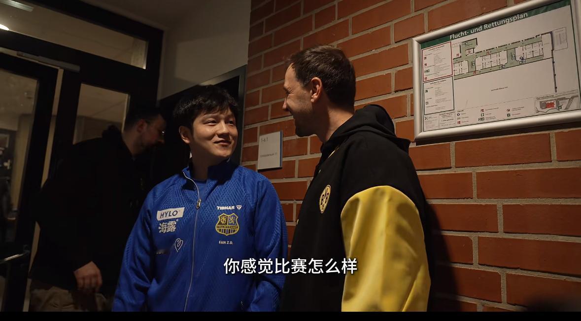 樊振东说:对手总在第二局给自己上压力! 横再次放出樊振东的采访: “谢谢你(波尔)的到来, 我感觉我今天适应的不错, 我尽了全力, 之前四强赛在大场馆, 客场与主场不同, 我需要尽快适应, 最终表现得很好, 每场比赛的第二局都非常艰难, 第一局打得不错, 对手往往第二局会上压力, 很开心, 这是我第一次对战多特蒙德, 赛前我还专门听了多特蒙德的队歌, 和我们上次看足球比赛一样, 大喊BVB, 希望我们可以继续约在一起看球!” 樊振东的英语水平越来越好, 基本上可以无障碍沟通了, 学语言真的是☹️开口开始, 今晚凌晨两点半, 樊振东携手莫雷加德出战 欧冠1/4决赛, 樊振东加油,萨尔加油!