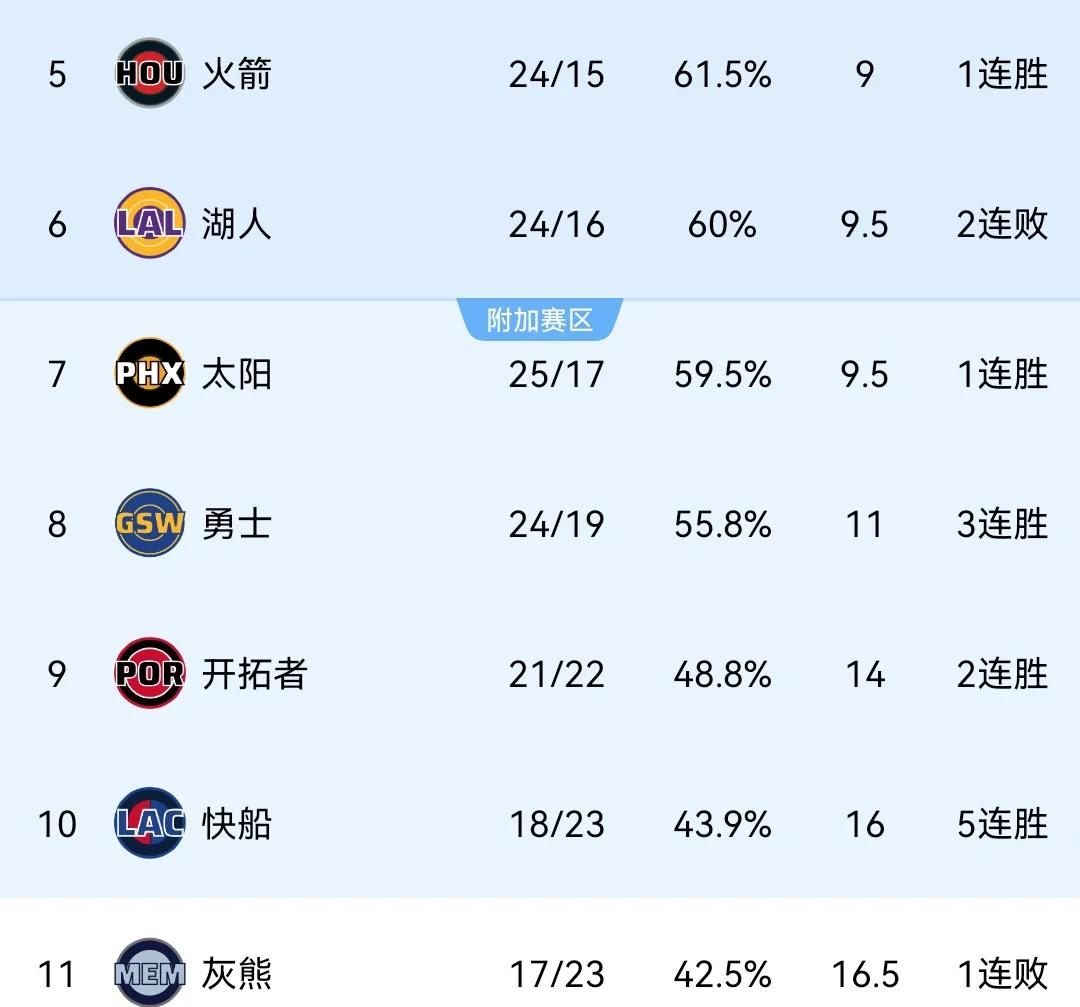 湖人距离附加赛仅“一步之遥”: 6、湖人:24胜16负 7、太阳:24胜16负 8、勇士:24胜19负 9、开拓者:21胜22负 10、快船:18胜23负 11、灰熊:17胜23负 湖人目前和太阳战绩持平,胜场数和太阳、勇士持平,其实基本上就相当于已经身处附加赛区域了。且相对于太阳和勇士近期的状态,湖人人员缺阵比较多,阵容深度也不够,输球会成为常态。 且更加难的是,湖人接下来要打一个8连客,这个阶段找不回状态,就要掉到勇士身后,成为西部第8了。更极端一点的话,甚至有可能被后来的快船赶上。